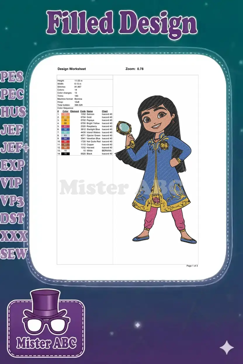 Princess detective girl with magnifying glass blue coat embroidery designs