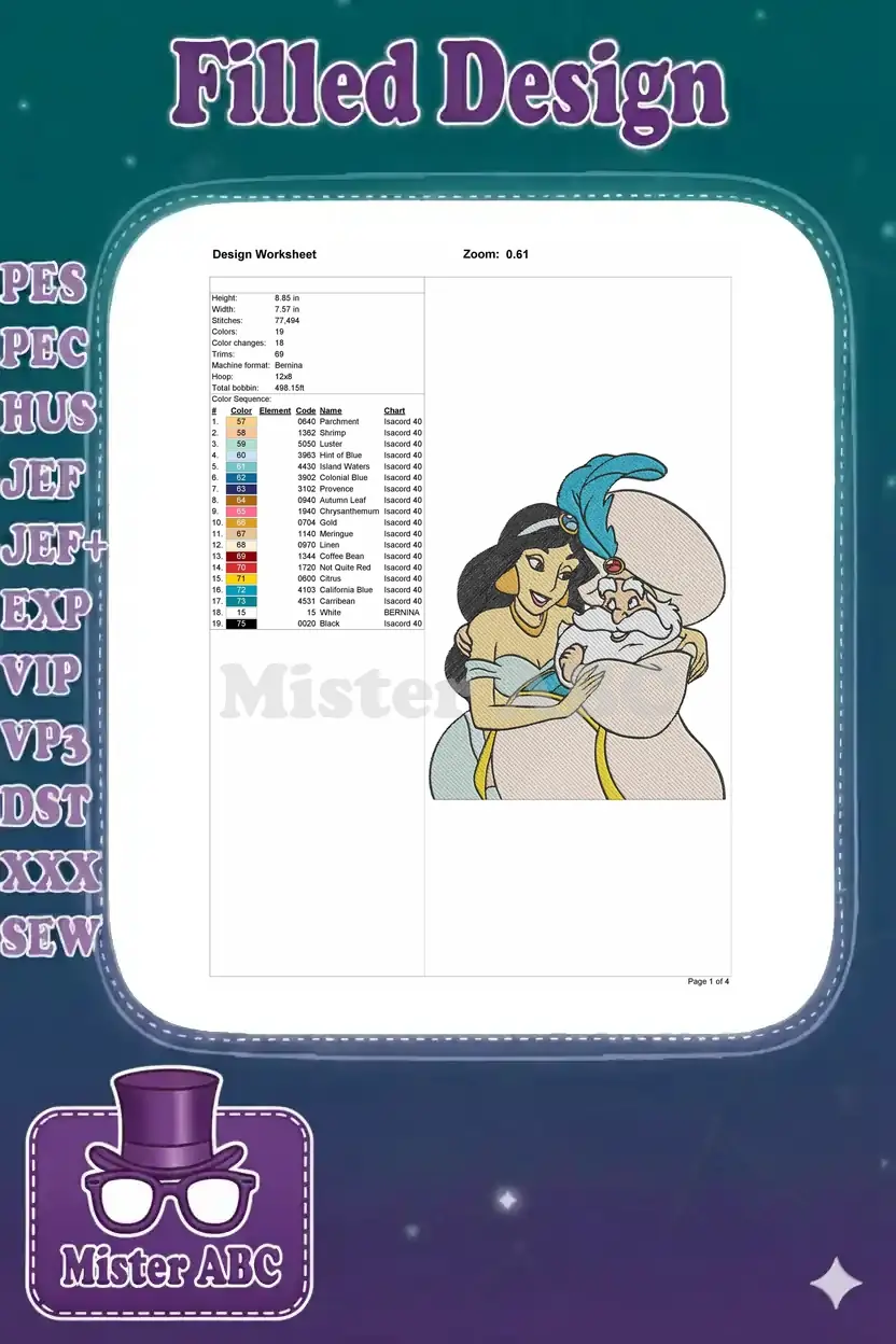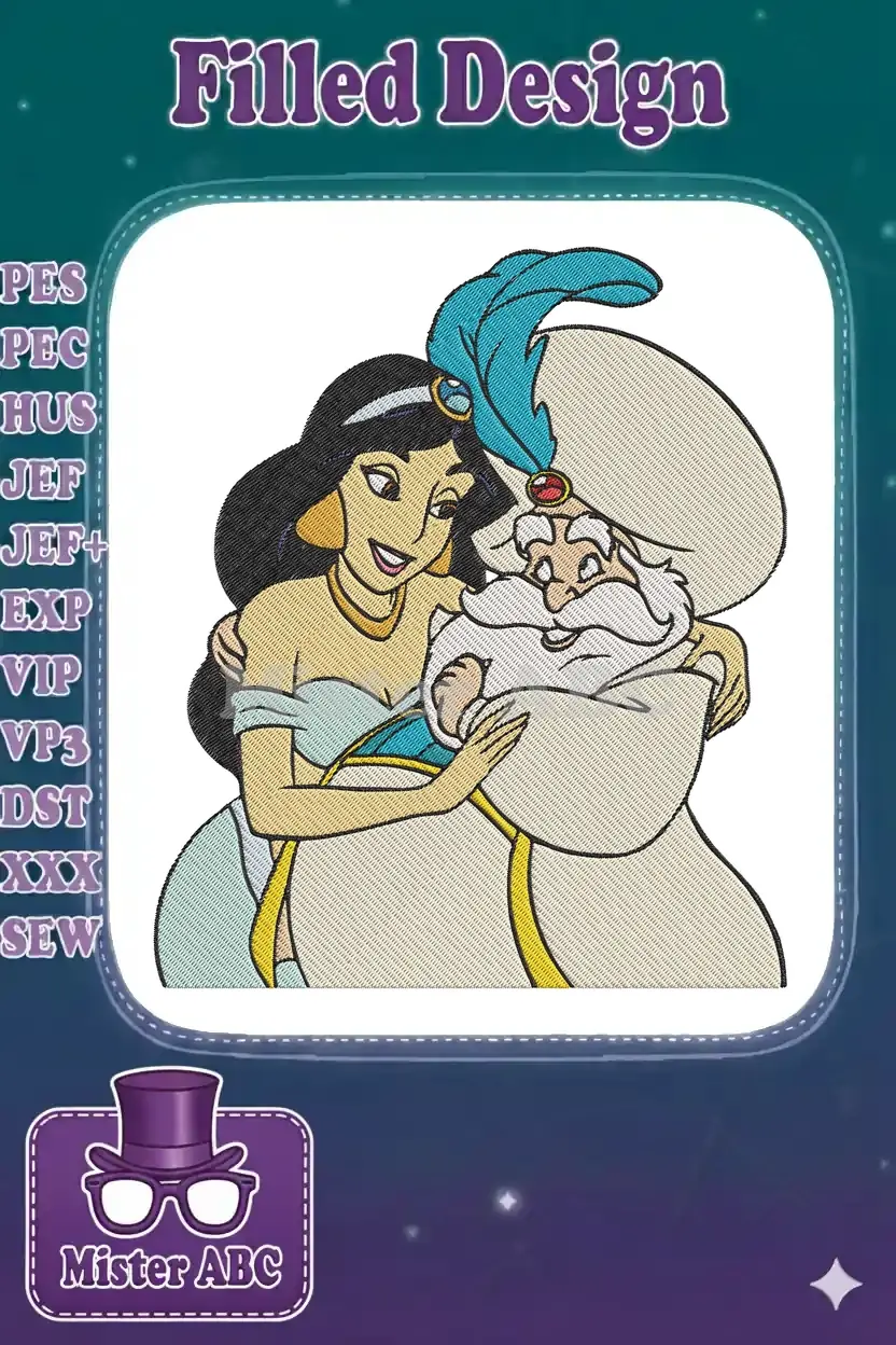 Princess Jasmine and Genie Hugging Friendship Embroidery Designs