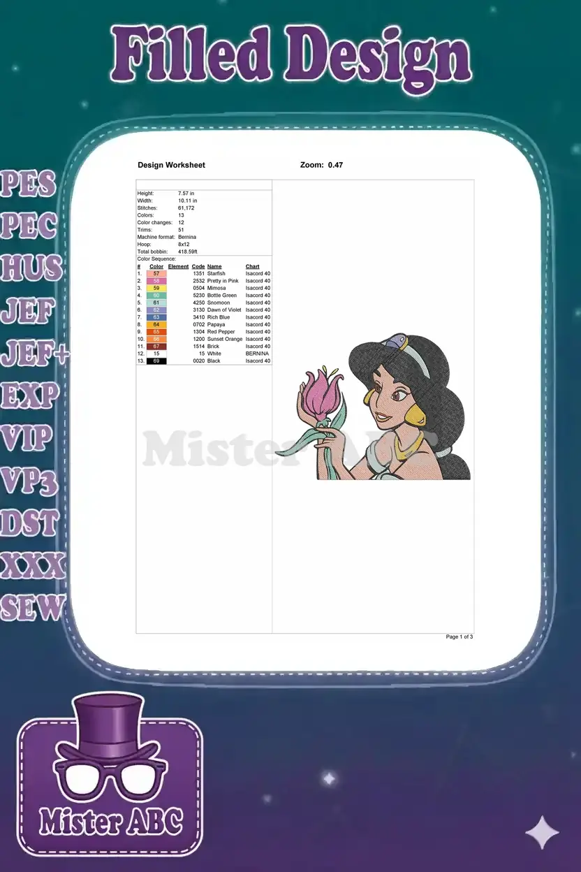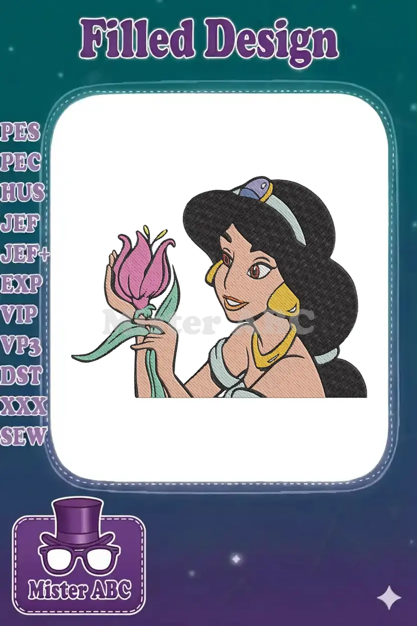 Princess Jasmine holding beautiful pink flower embroidery designs