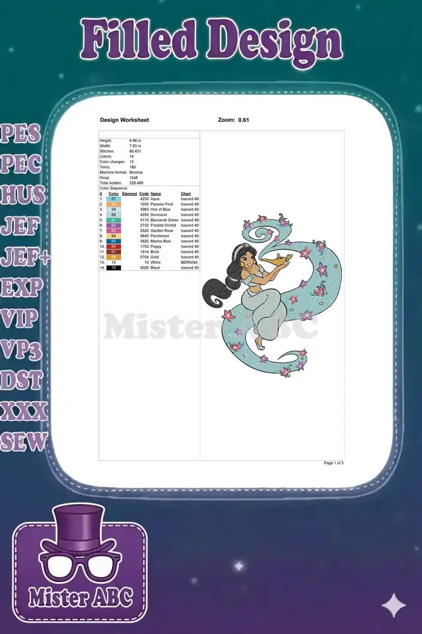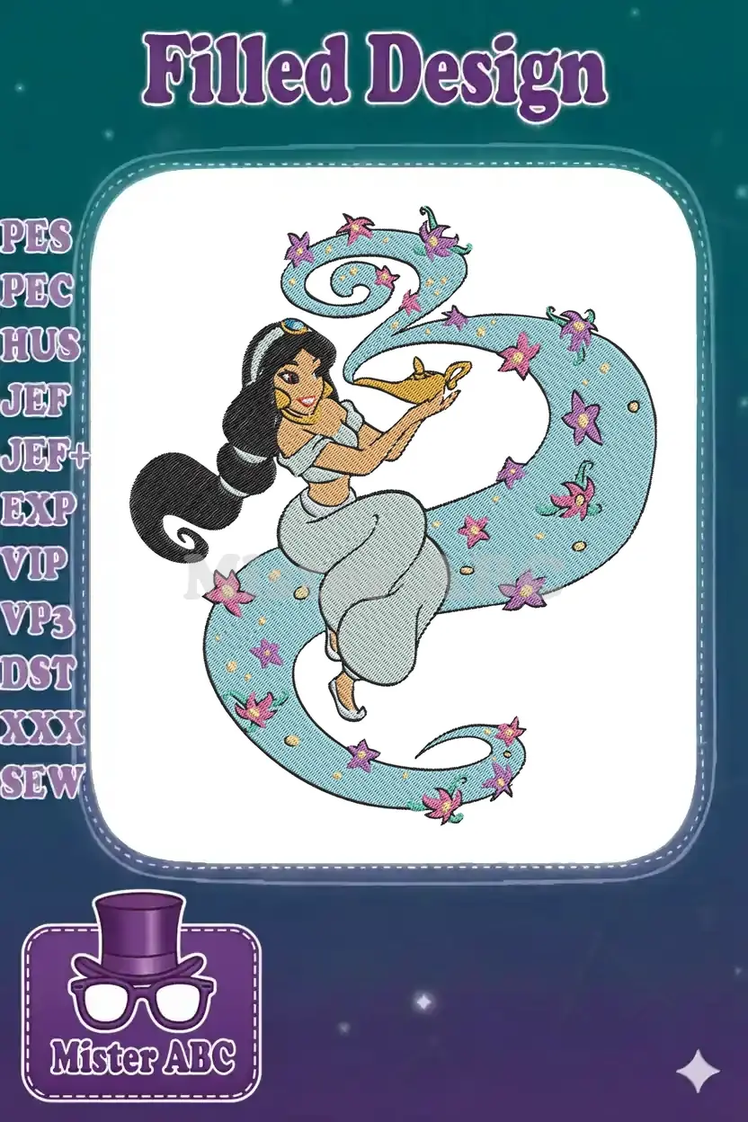 Princess Jasmine with Magic Lamp Swirling Ribbon Flower Embroidery Designs