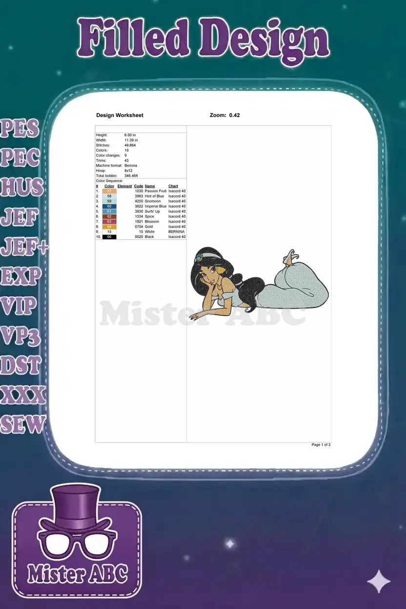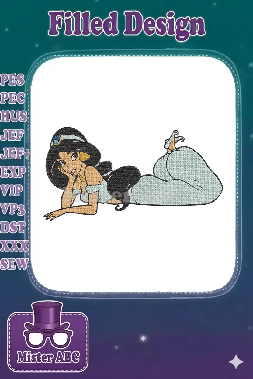 Princess Jasmine reclining pose embroidery designs for Disney fans