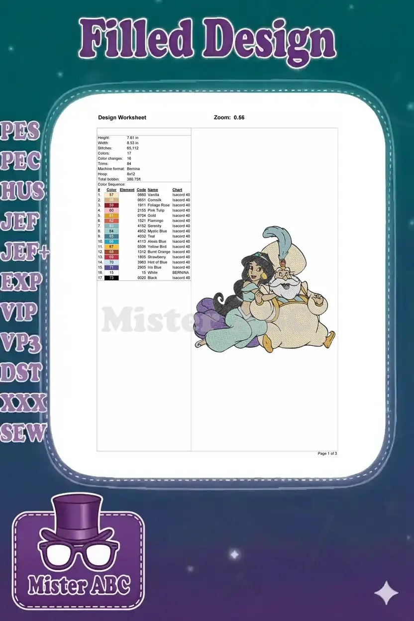 Enchanting embroidery design featuring Princess Jasmine and the Sultan, perfect for Disney fans. Add a touch of magic to any fabric.