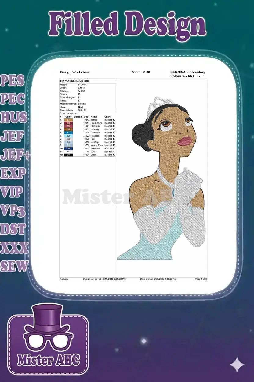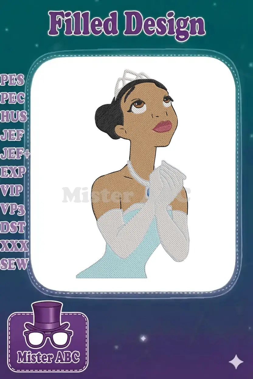 Princess Tiana Wishing in Blue Gown Embroidery Designs