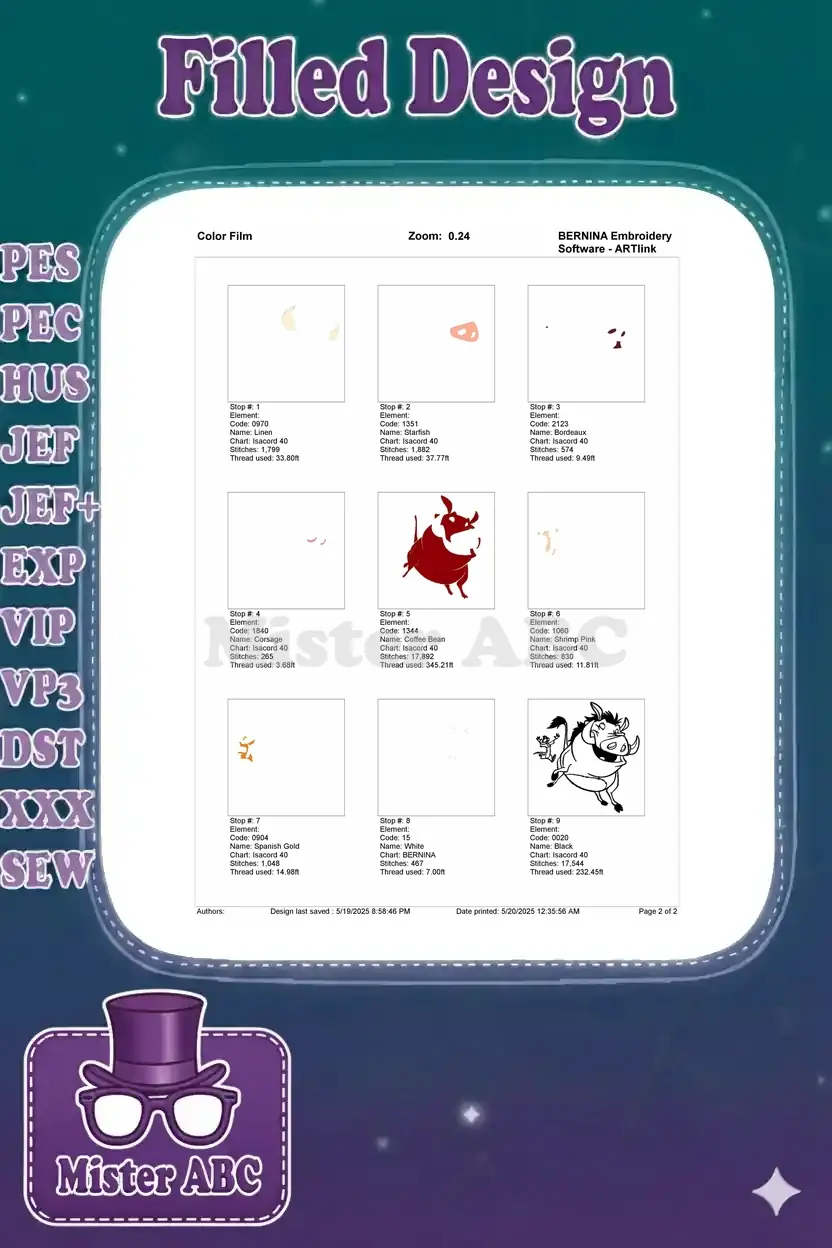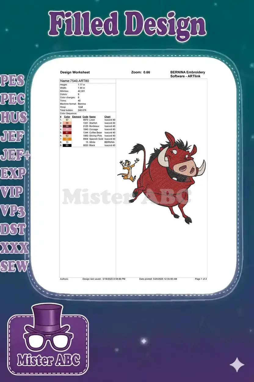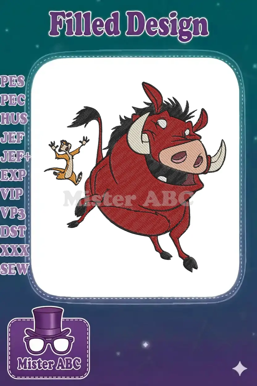 Pumbaa the warthog and Timon meerkat running embroidery designs