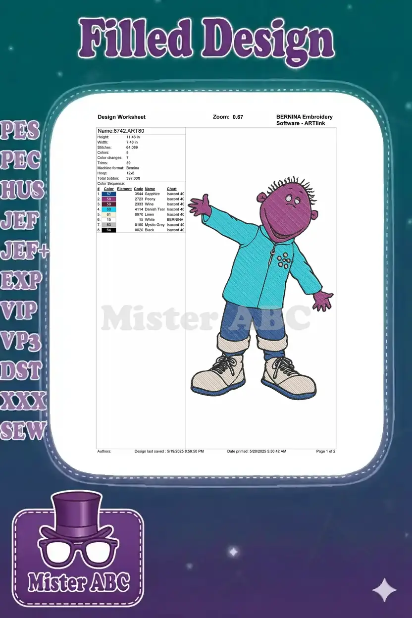 Purple Toodloo character embroidery designs for kids apparel - Instant Download Purple Toodloo character embroidery designs for kids apparel – Instant Download
