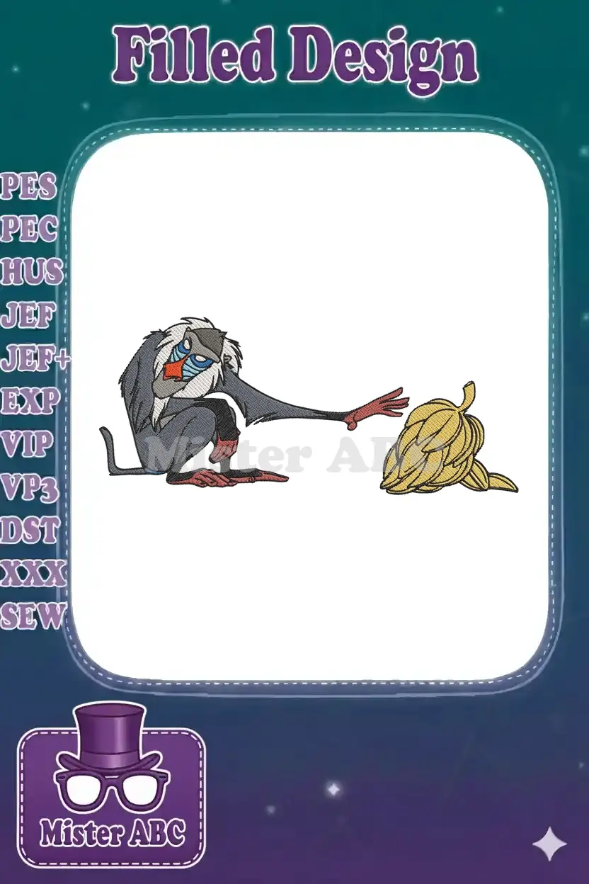 Rafiki the wise baboon reaching for a banana pile embroidery designs