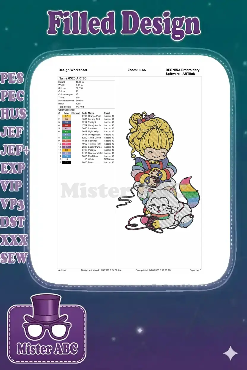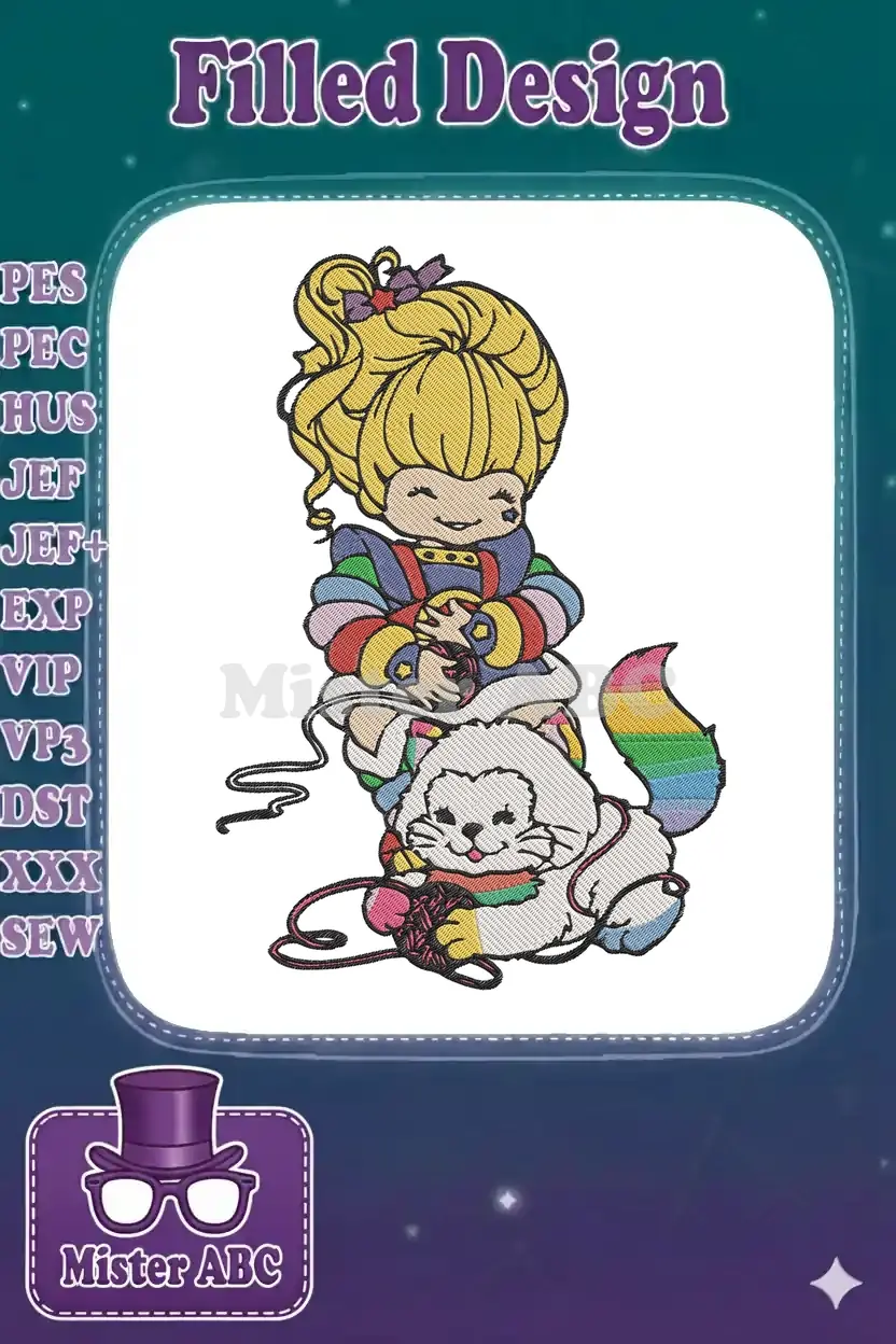 Rainbow Brite girl and cat knitting colorful yarn embroidery designs