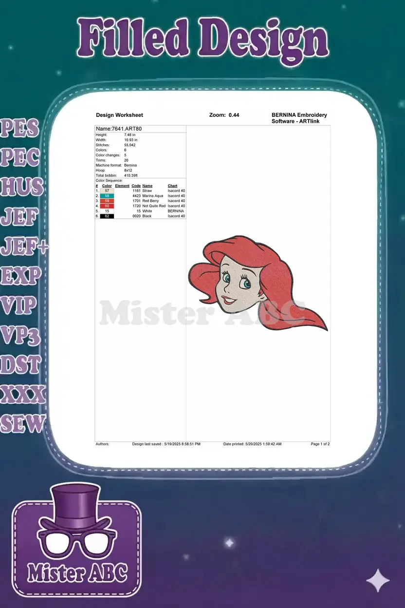 Red-haired Ariel Disney Princess Little Mermaid smiling face embroidery designs