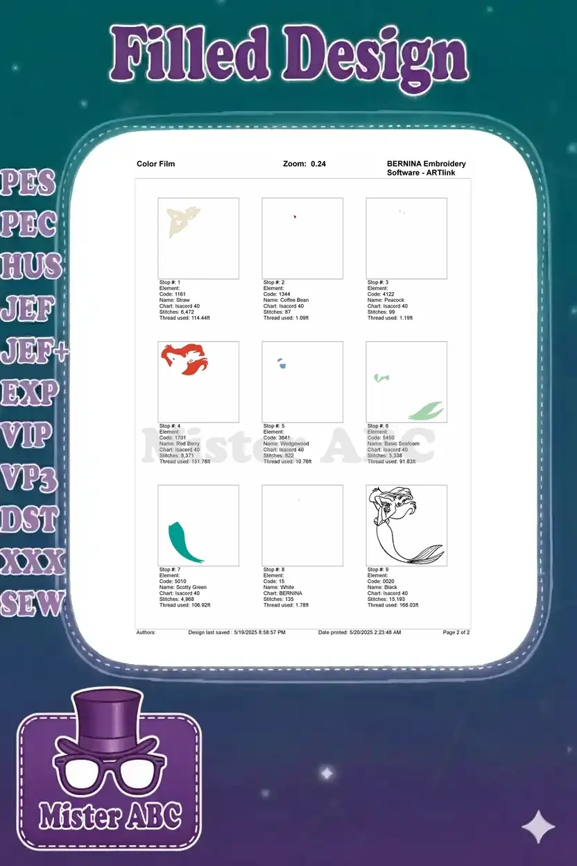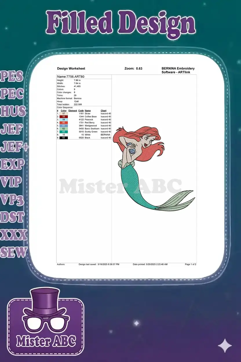 Red-haired Ariel Little Mermaid princess holding seashell embroidery designs