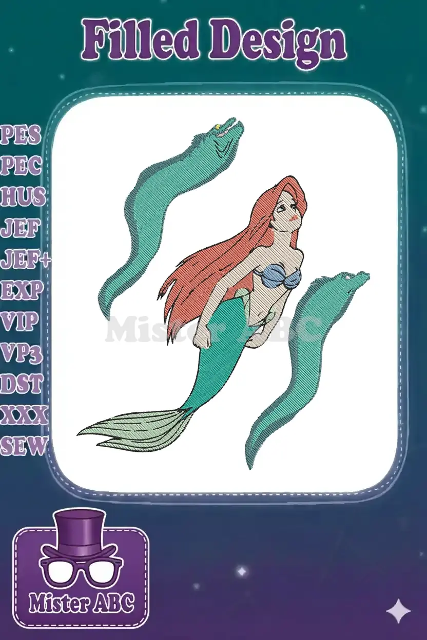 Captivating embroidery design featuring Ariel and two eels, perfect for fans of aquatic fantasy and classic tales.