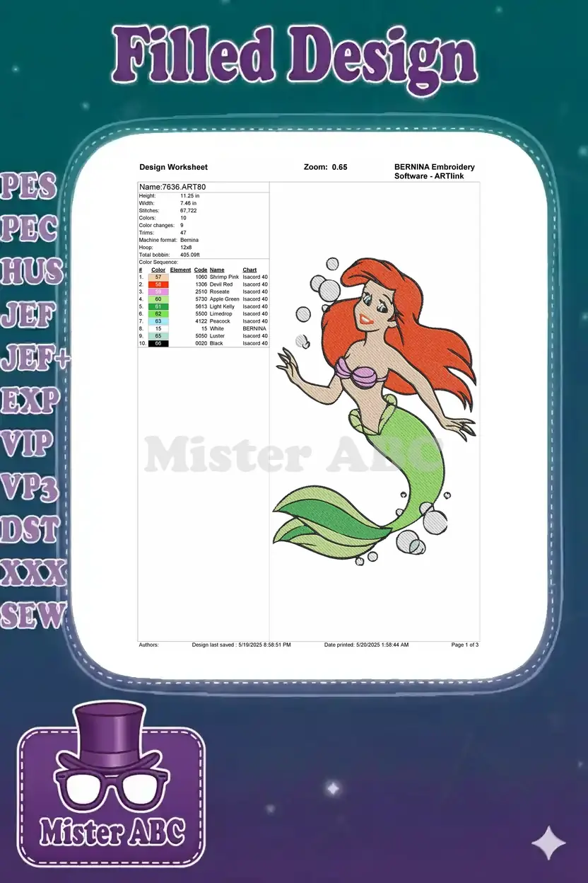 Red-Haired Mermaid Princess Under the Sea Embroidery Designs with Bubbles