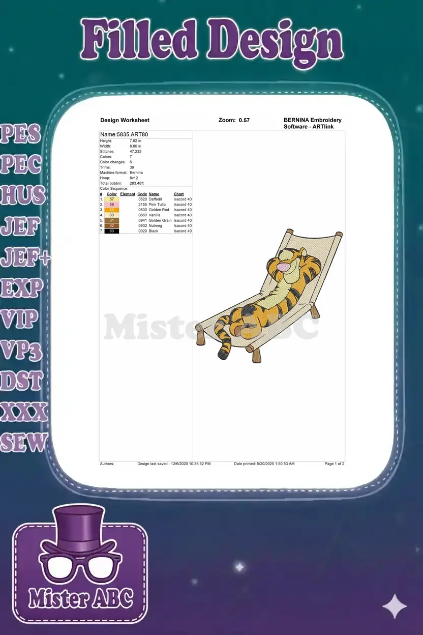 Relaxing Tigger embroidery design for a touch of whimsy. Perfect for fans of Winnie the Pooh, adding a playful, laid-back vibe to any project. Enjoy this cheerful, detailed stitch-out.
