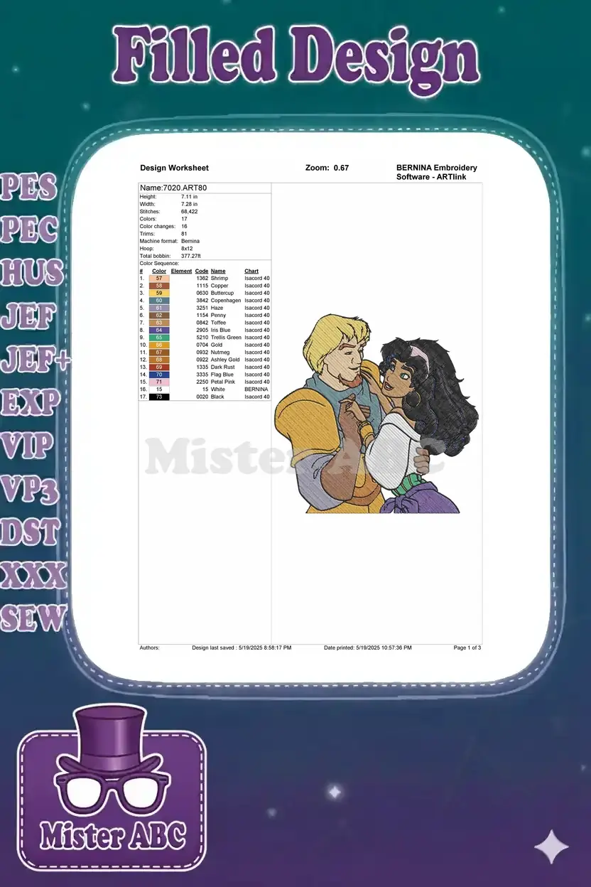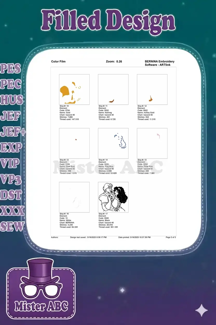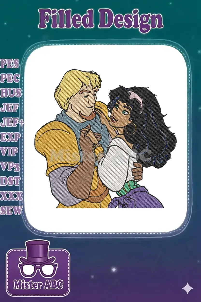 Romantic animated blonde man dark-haired woman couple embroidery designs
