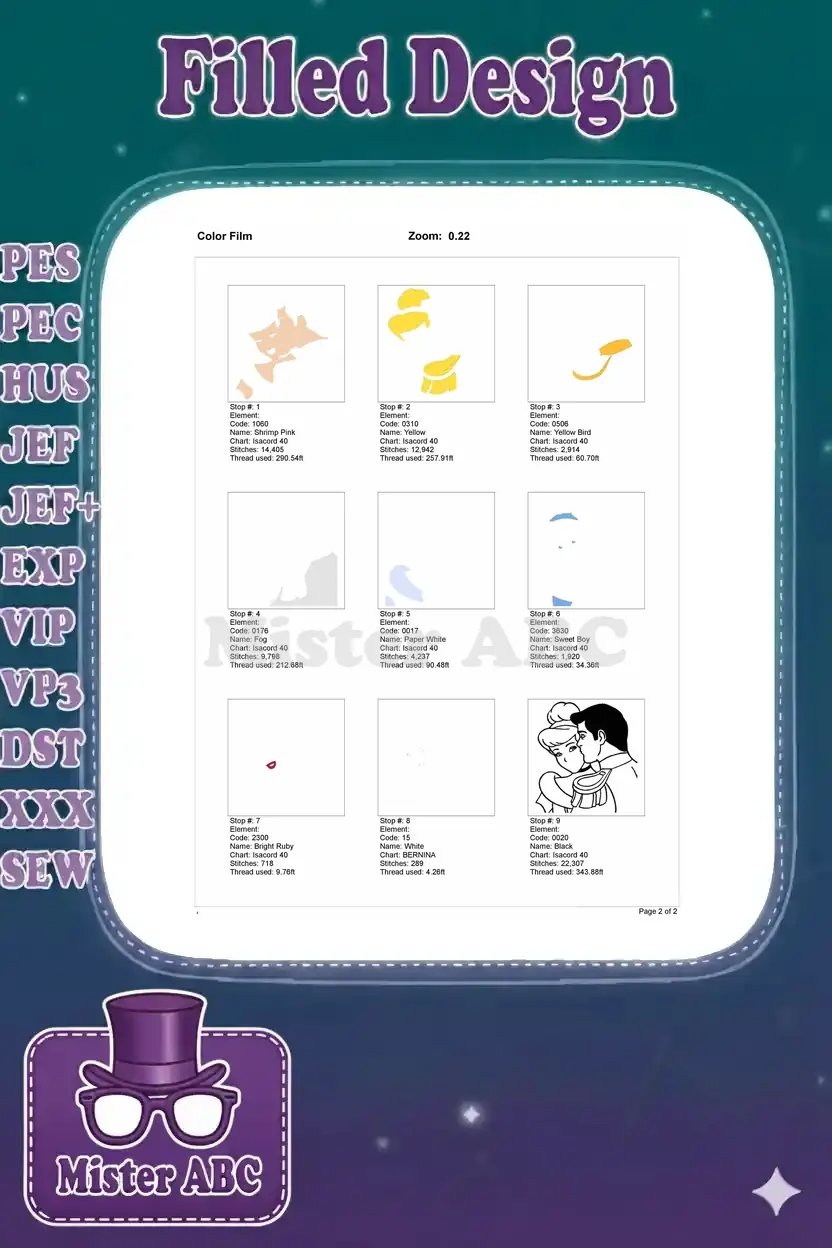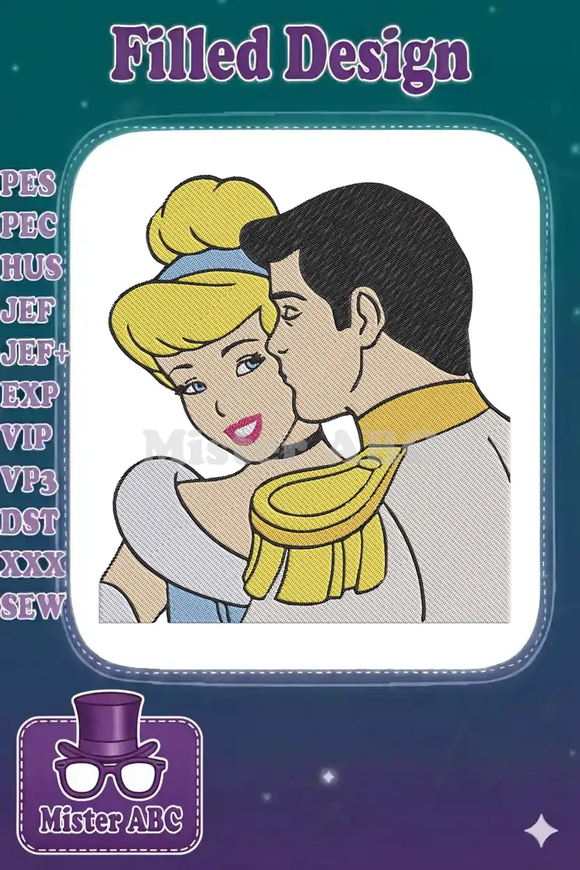 Romantic Cinderella and Prince Charming Couple Kiss Embroidery Designs