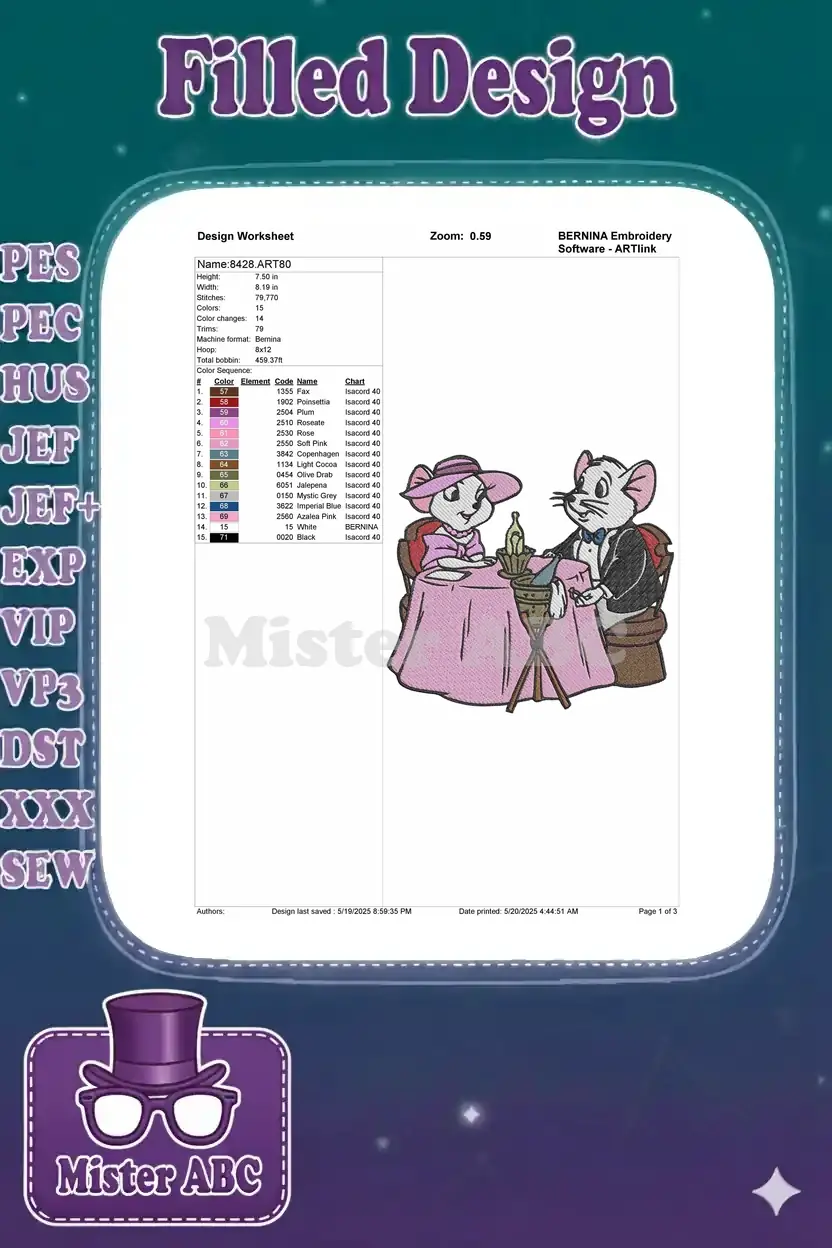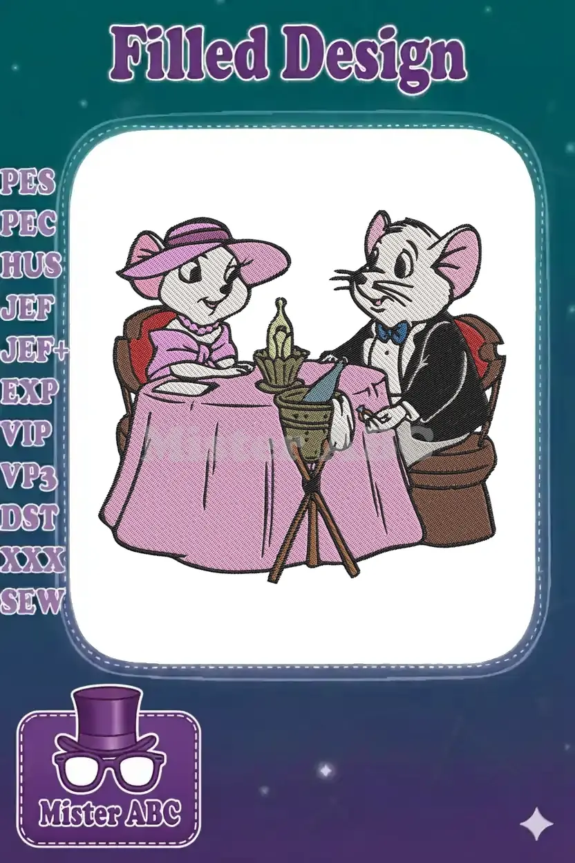 Experience the charm of Miss Bianca and Bernard’s romantic dinner with this delightful embroidery design, perfect for fans.