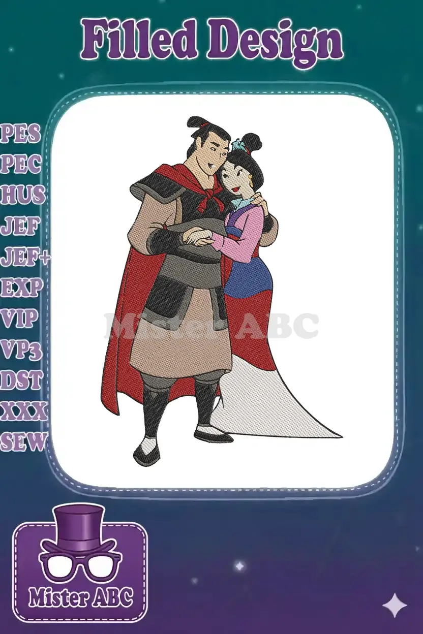 Romantic Mulan and Captain Shang embracing Disney embroidery designs