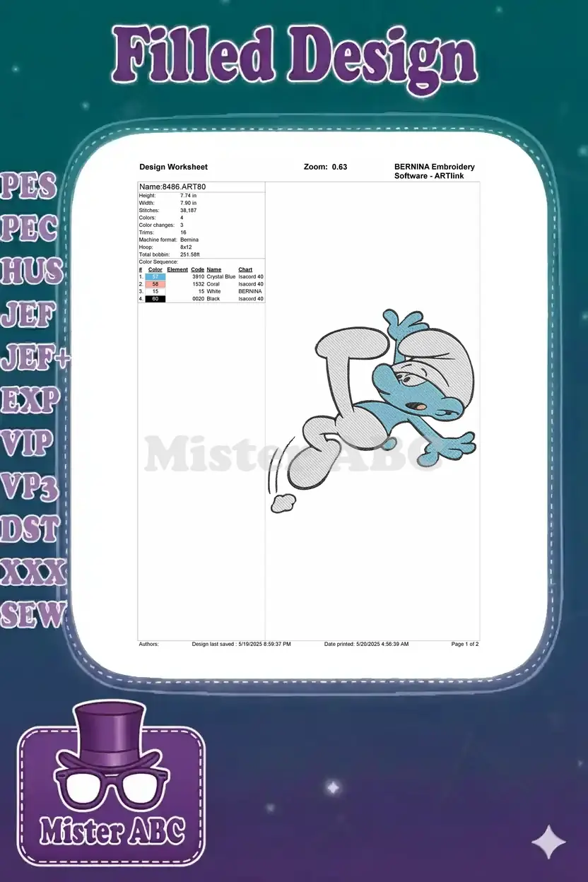 Running Smurf Cartoon Character Dynamic Pose Embroidery Designs