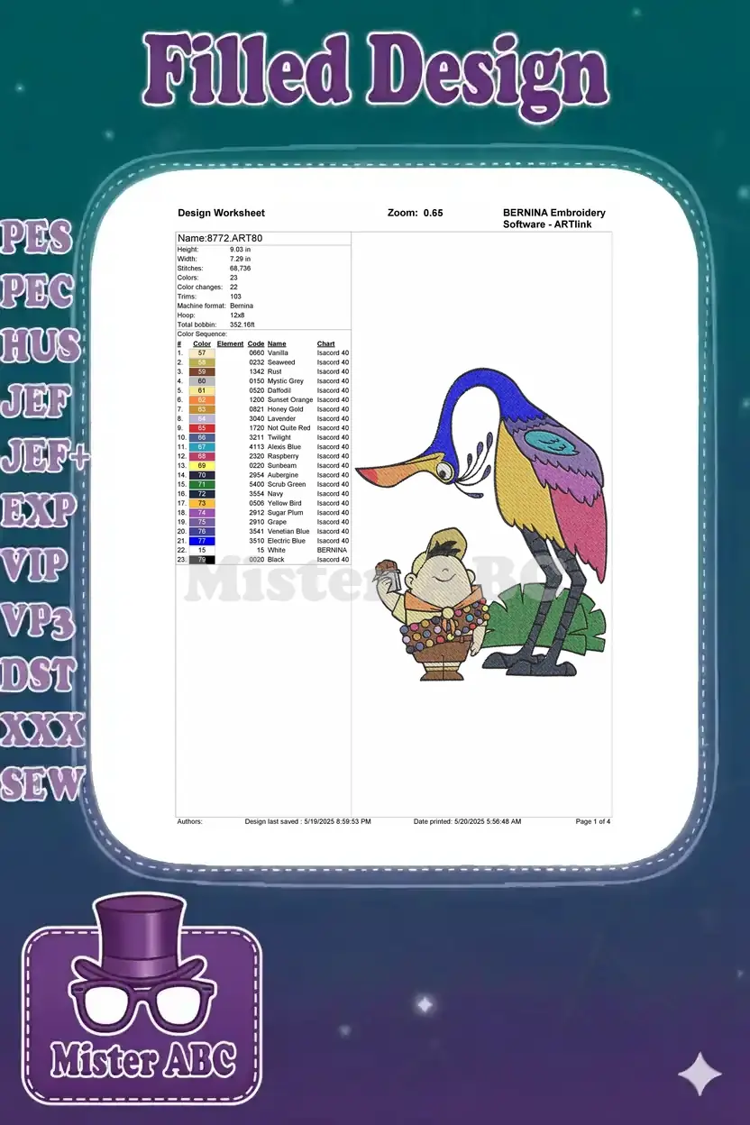 Russell and Kevin Up movie colorful bird embroidery designs – Instant Download