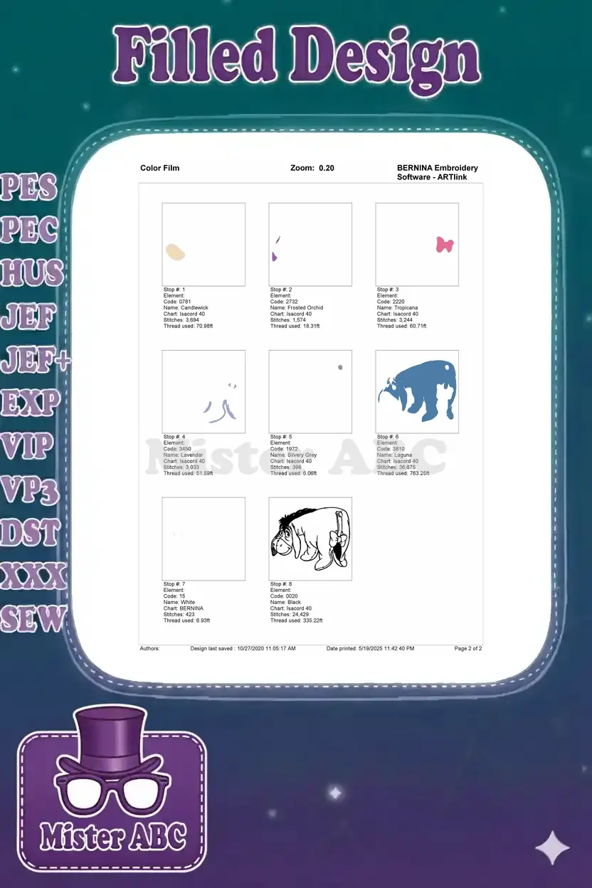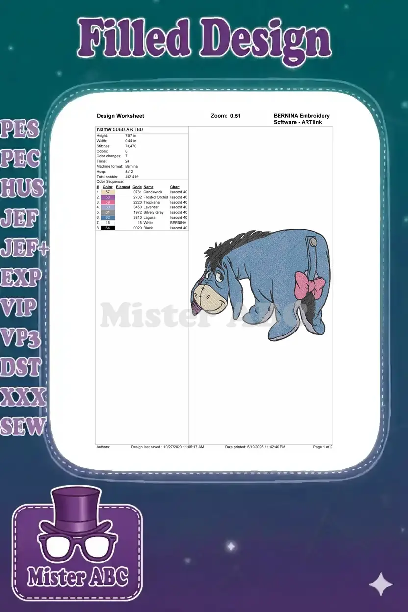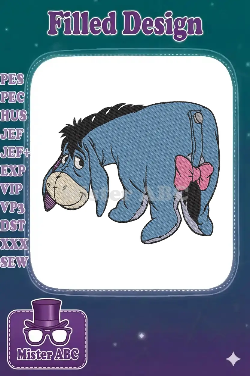 Sad Eeyore blue donkey with pink bow embroidery designs
