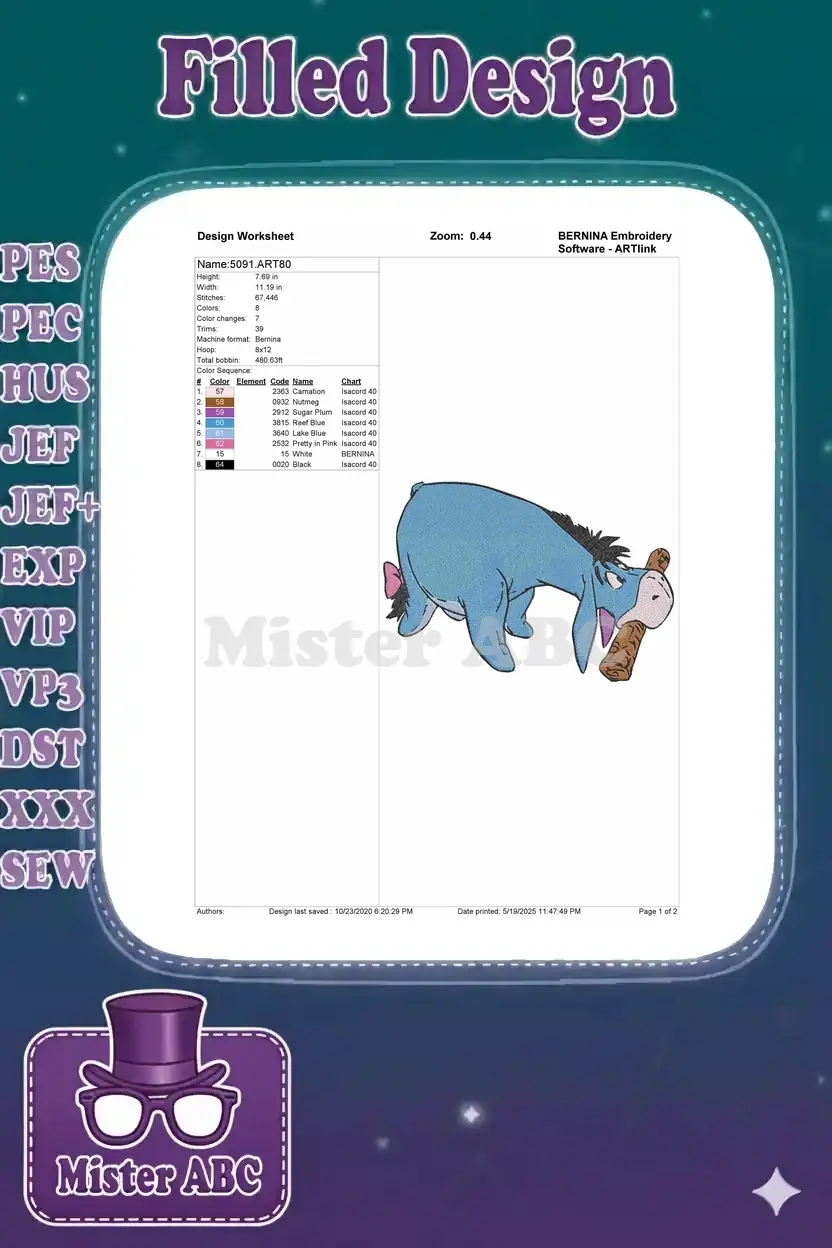 Sad Eeyore blue donkey with pink bow tail embroidery designs