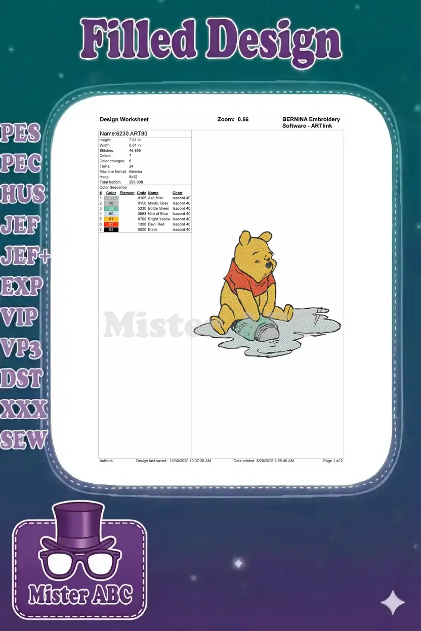 Capture the classic charm of Winnie the Pooh with this endearing embroidery design, perfect for fans of the Hundred Acre Wood.