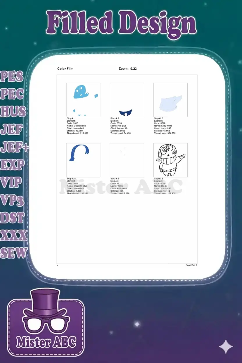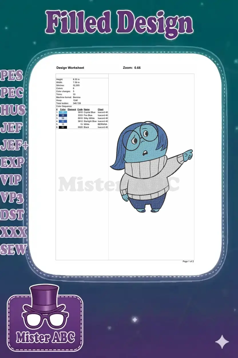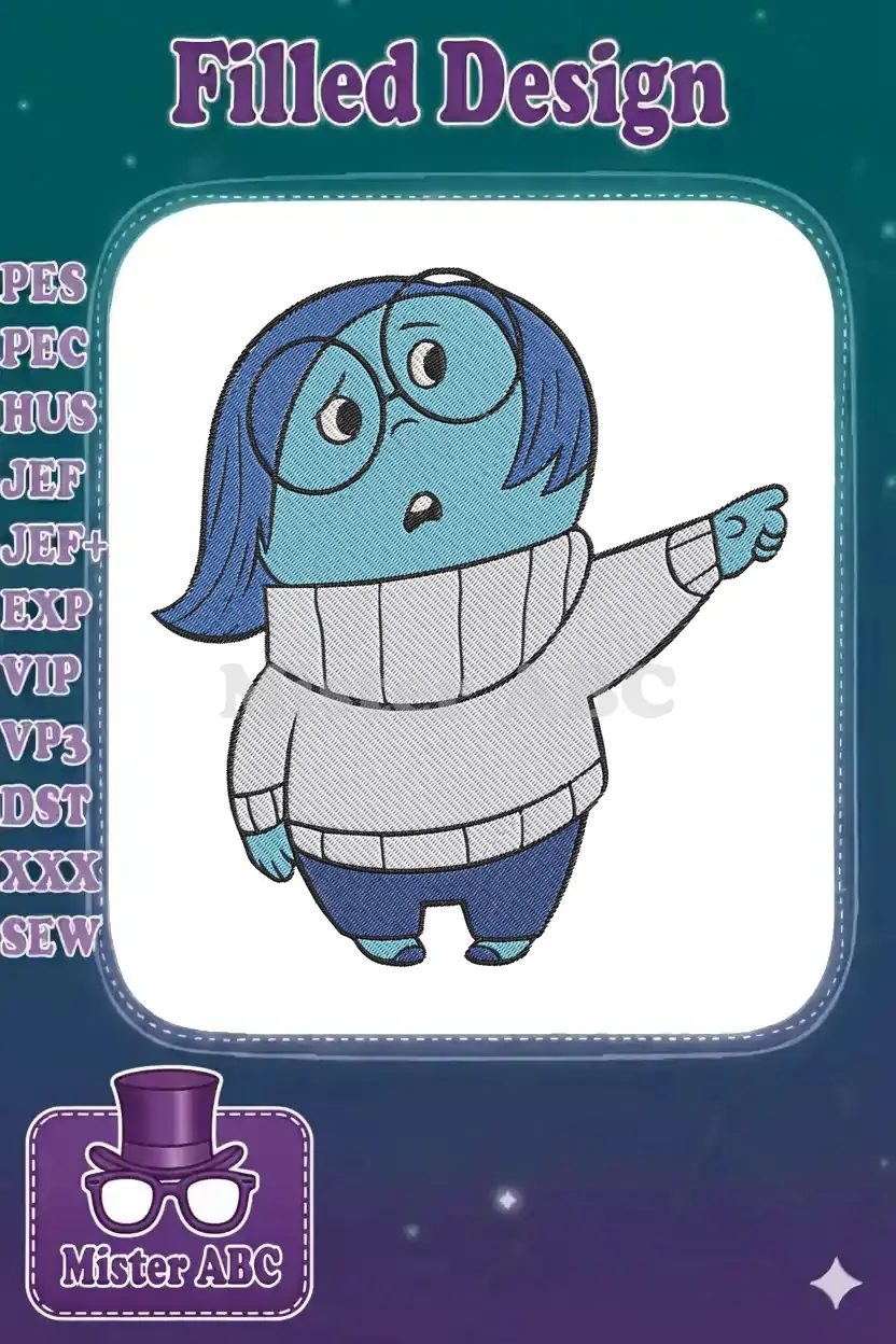 Sadness from Inside Out blue character pointing embroidery designs