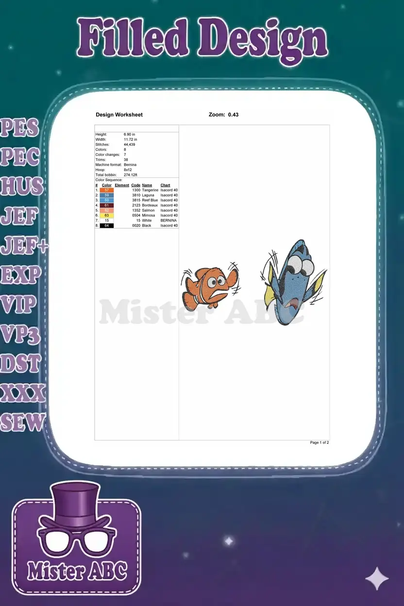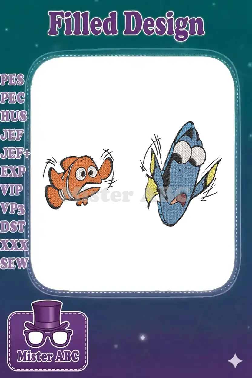 Embroider the iconic, startled expressions of Marlin and Dory! A vibrant design bringing beloved animated fish to life with cartoon charm.