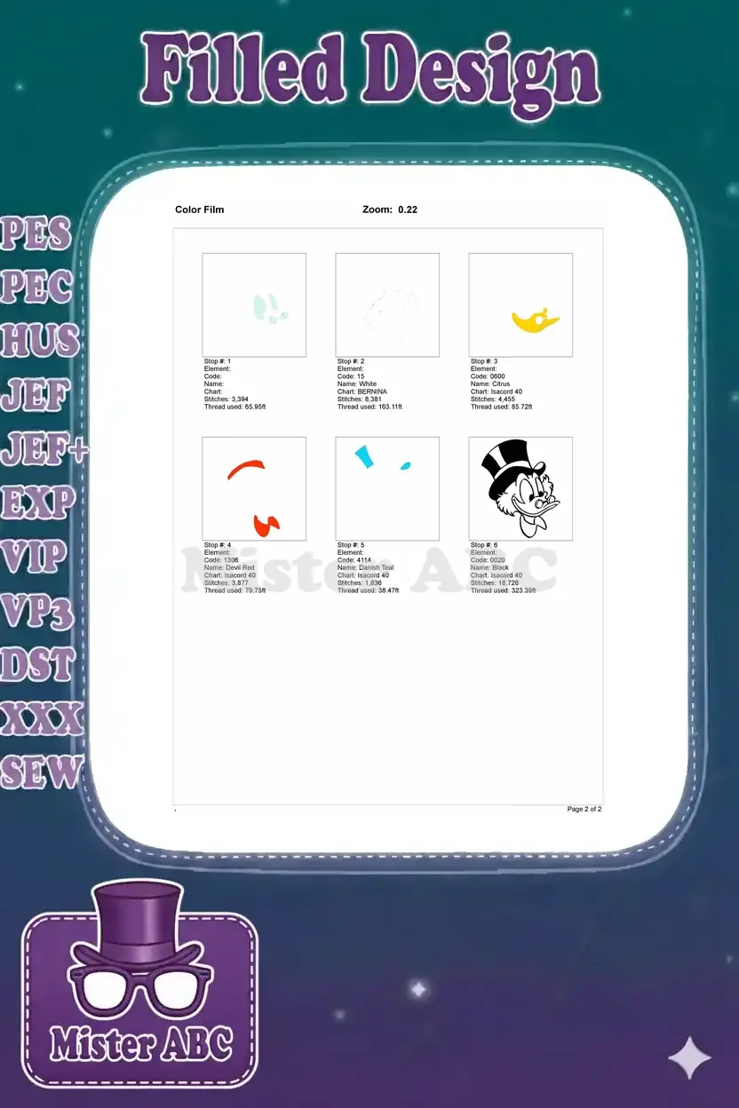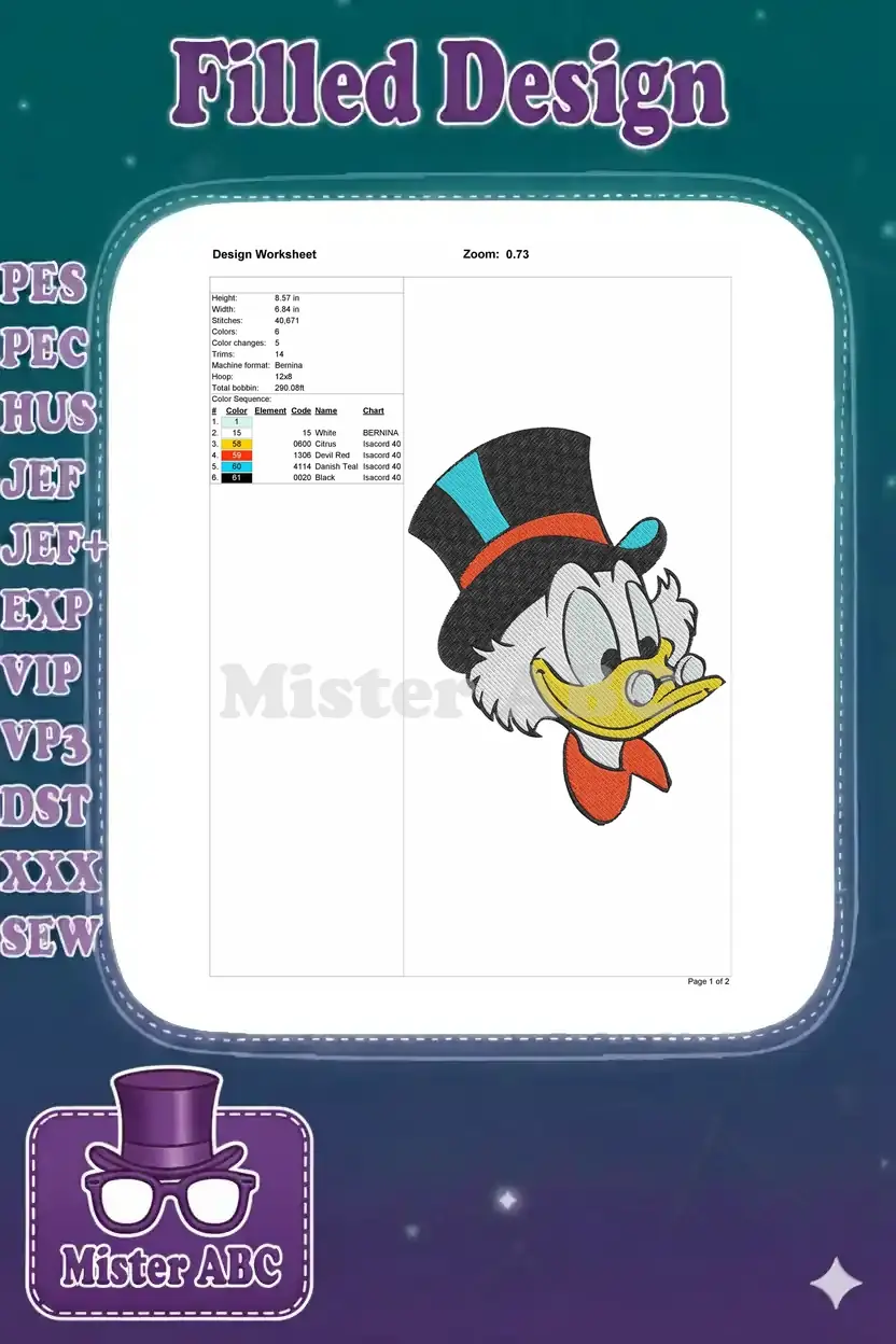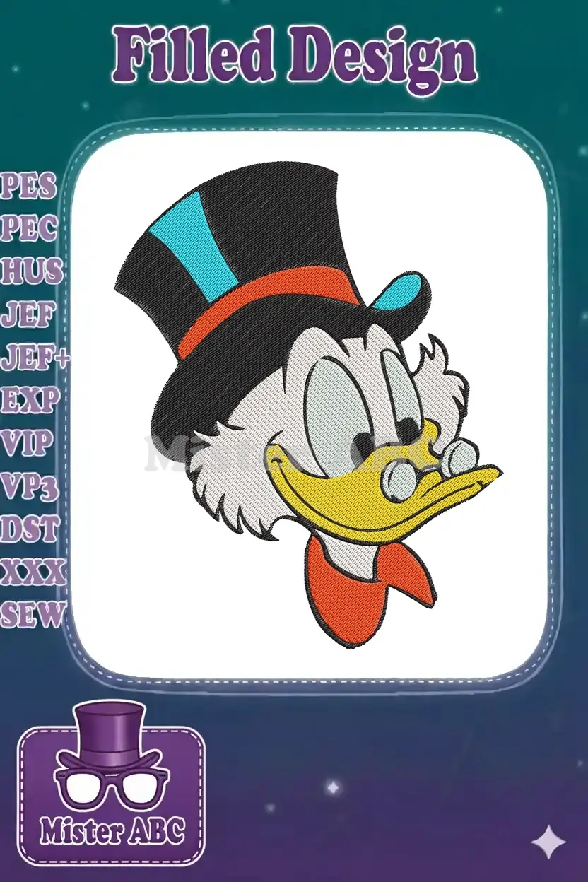Scrooge McDuck Elegant Cartoon Character Top Hat Embroidery Designs