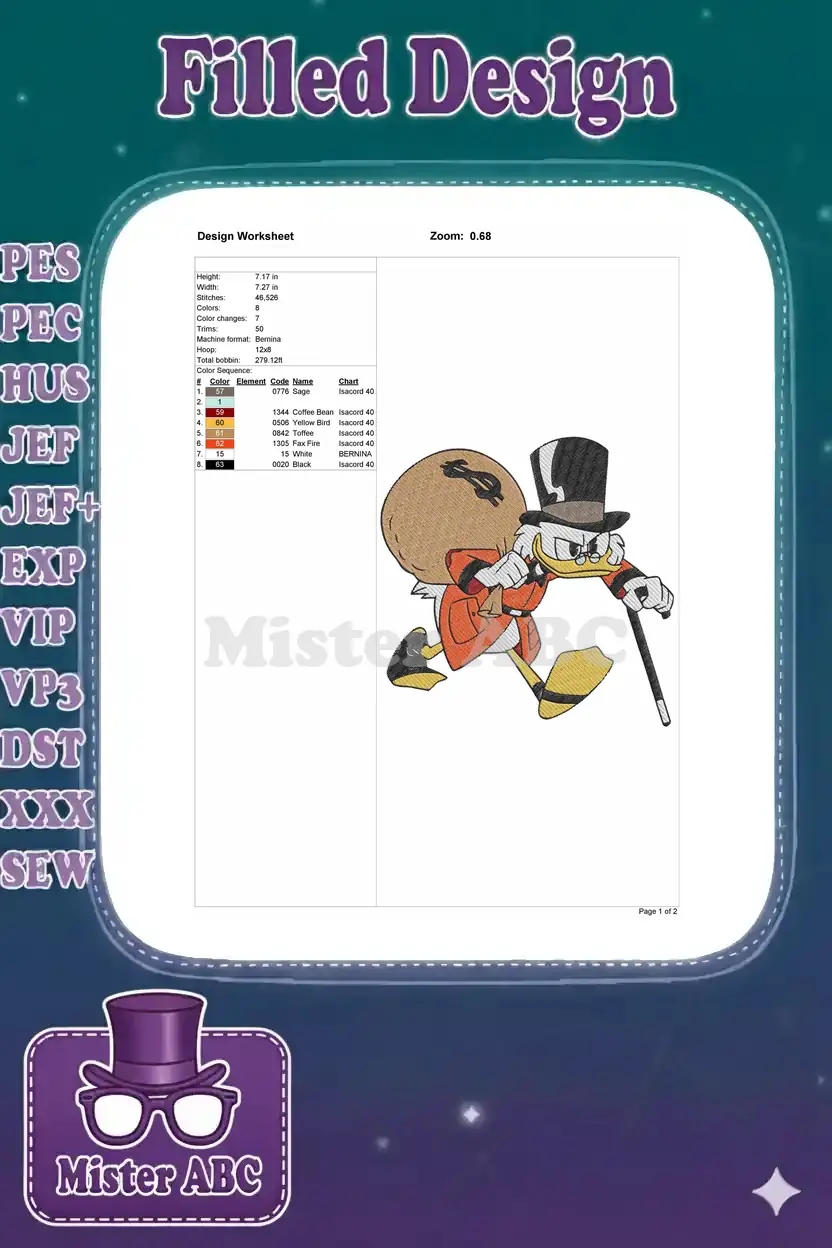 Scrooge McDuck Running with Money Bag Embroidery Designs