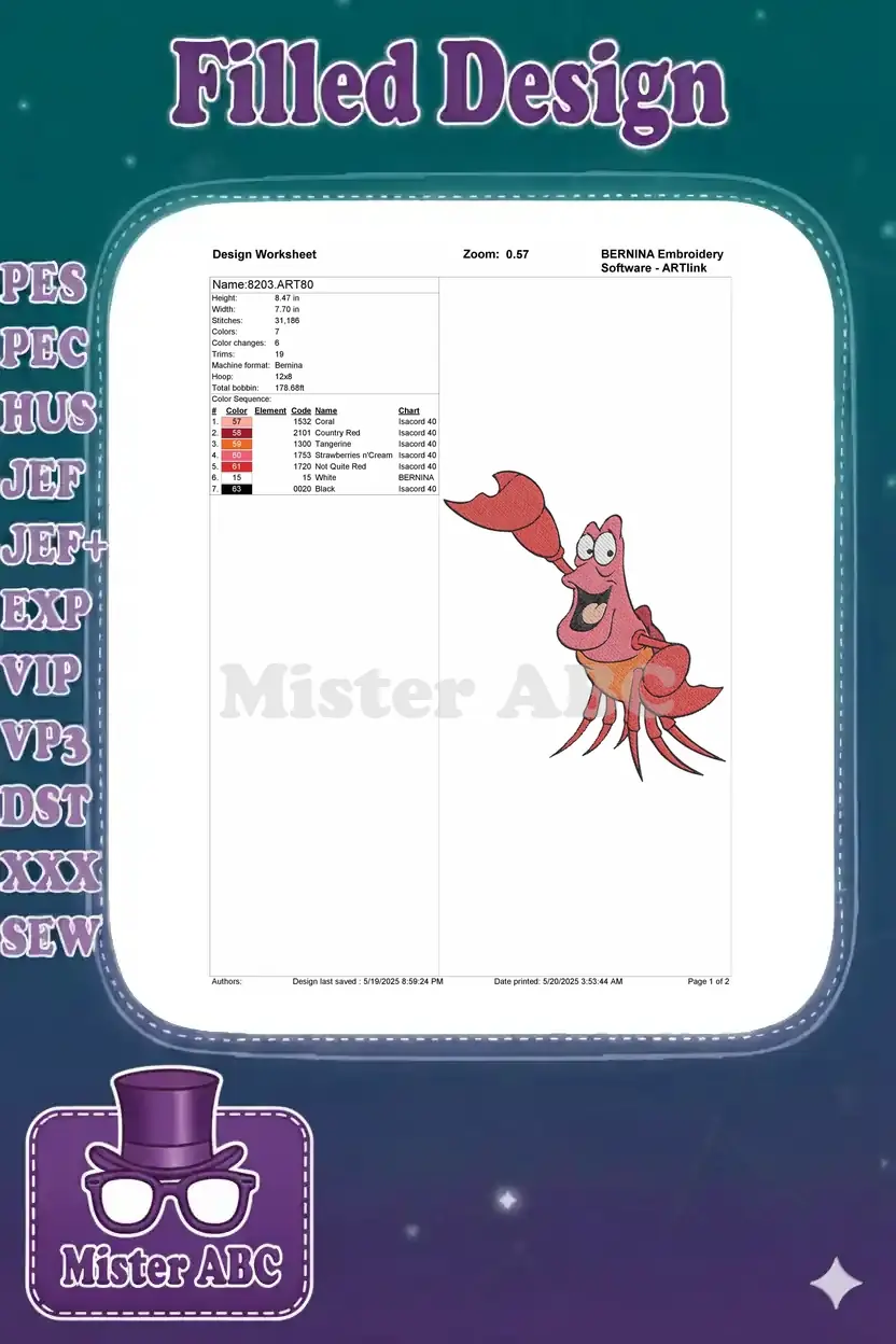 Sebastian The Crab Happy Cartoon Embroidery Designs