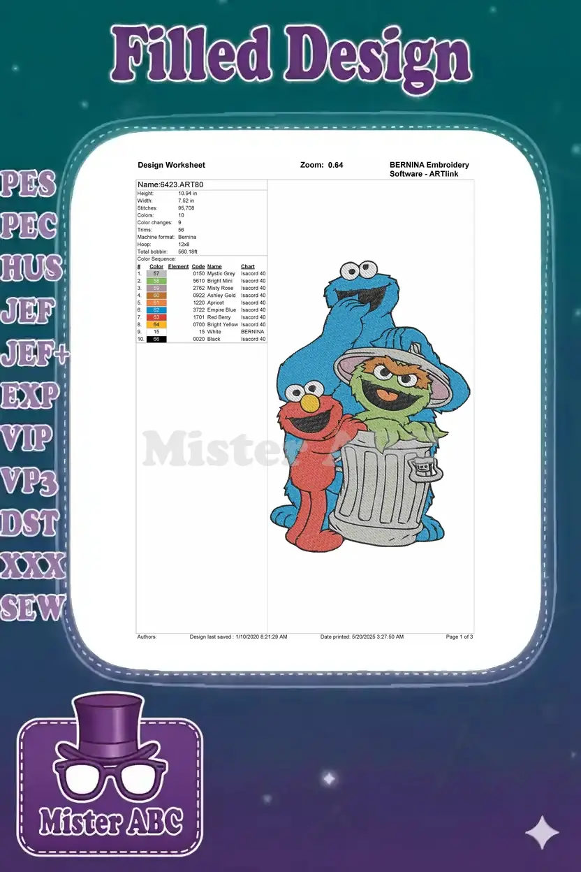 A delightful embroidery design featuring Elmo, Cookie Monster, and Oscar the Grouch, perfect for fans.