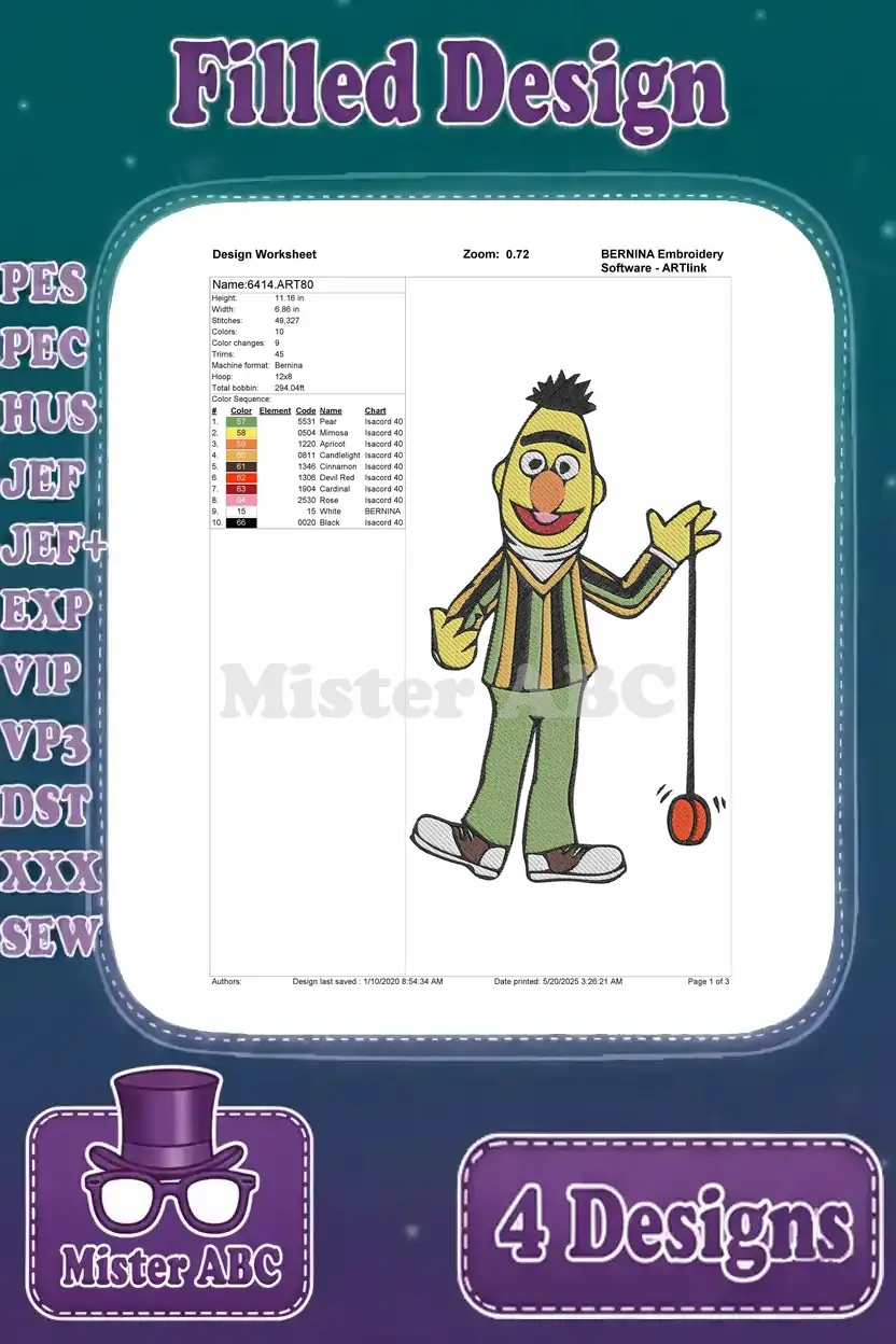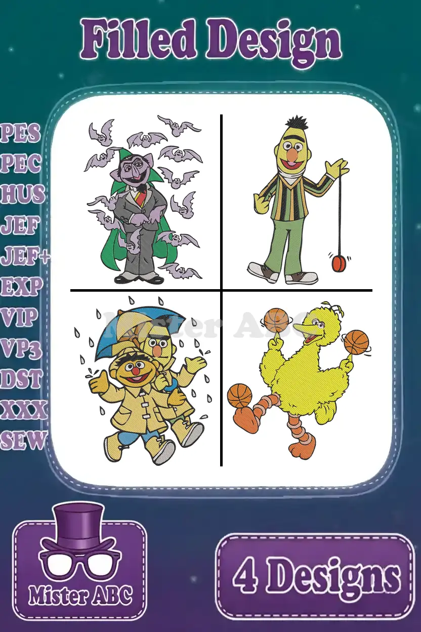 Sesame Street Muppets Count Von Count Bert With Yoyo And Ernie With Rubber Duckie – Filled Embroidery Design