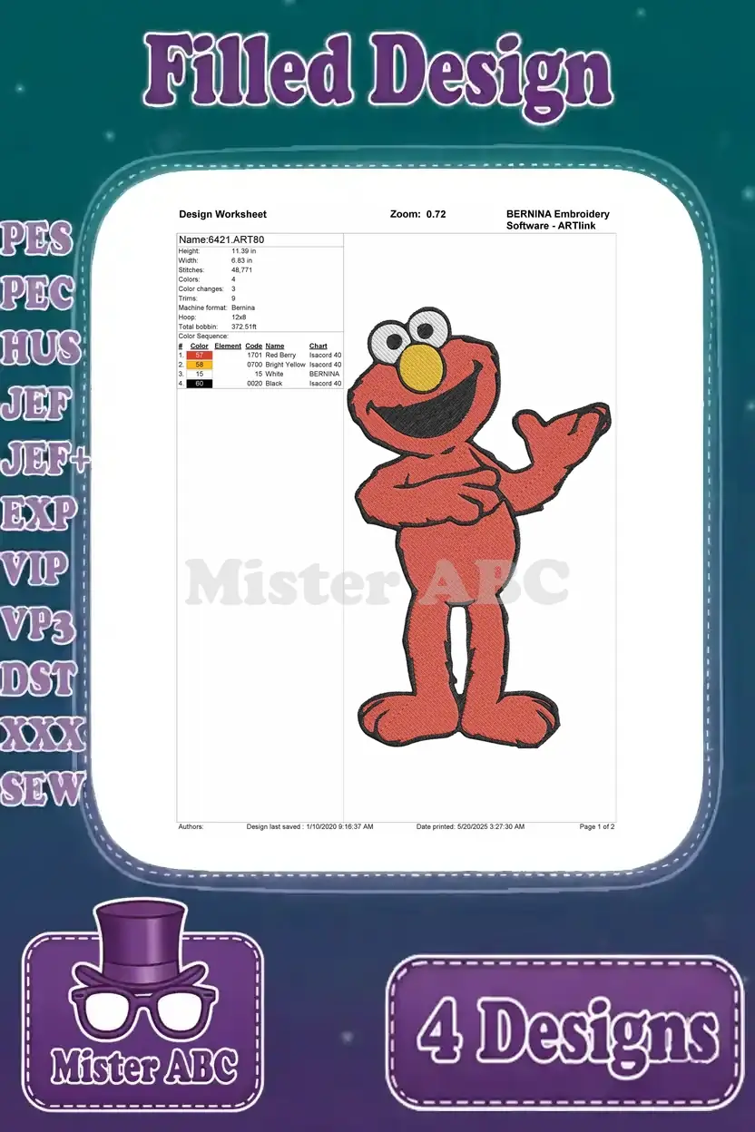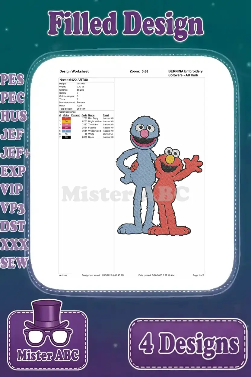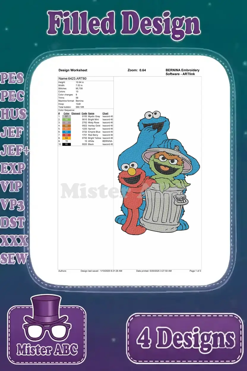 Sesame Street Muppets Elmo Waving Grover Hugging Elmo Cookie Monster In Trashcan – Filled Embroidery Design