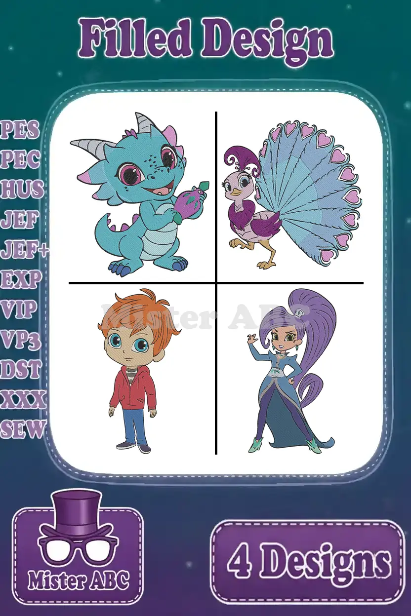 Shimmer And Shine Characters Nazboo Dragon Zac Human Friend And Zeta The Sorceress – Filled Embroidery Design