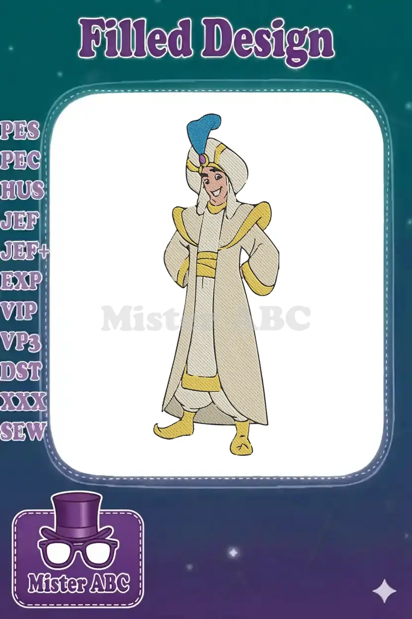 Captivating Prince Ali embroidery design, perfect for fans of classic animated tales. Add a touch of magic to any project.