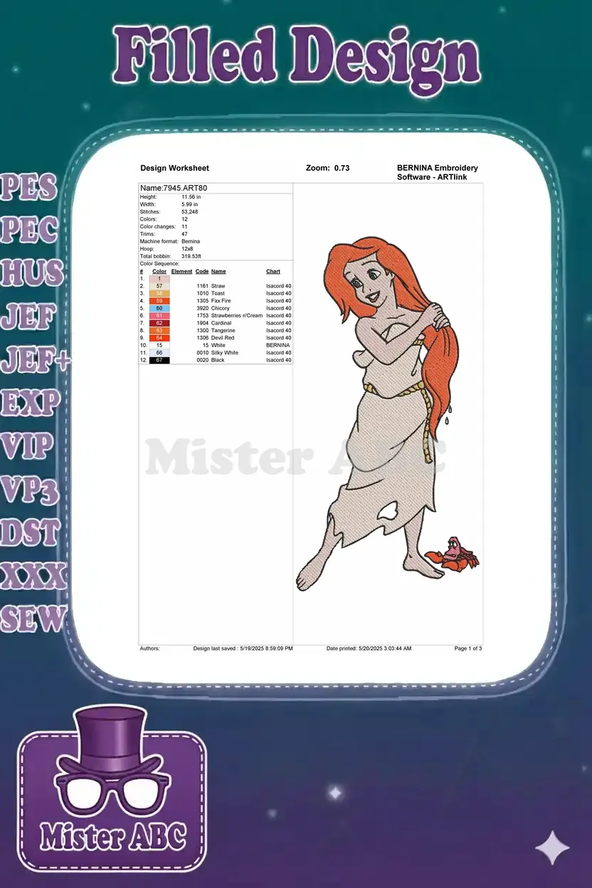Enchanting Ariel embroidery design, featuring the beloved mermaid in her rags with Sebastian. Perfect for Disney fans and projects!