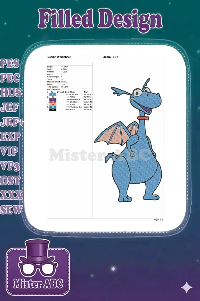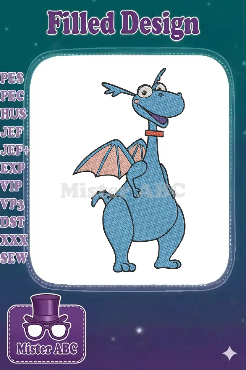 Smiling Blue Cartoon Dragon with Pink Wings Embroidery Designs