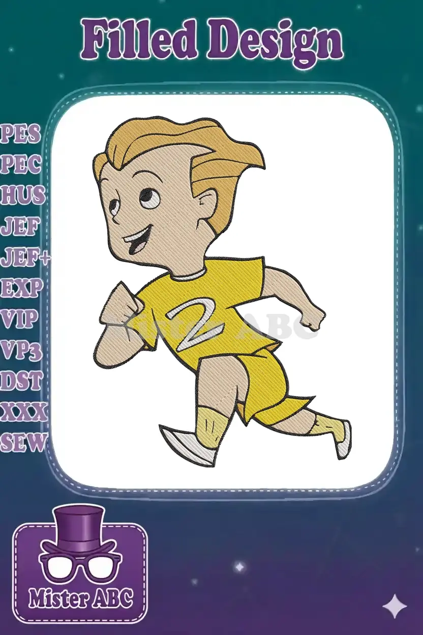 Dynamic embroidery design featuring a cheerful cartoon boy in a yellow running outfit with number 2. Perfect for kids’ apparel and sporty projects.