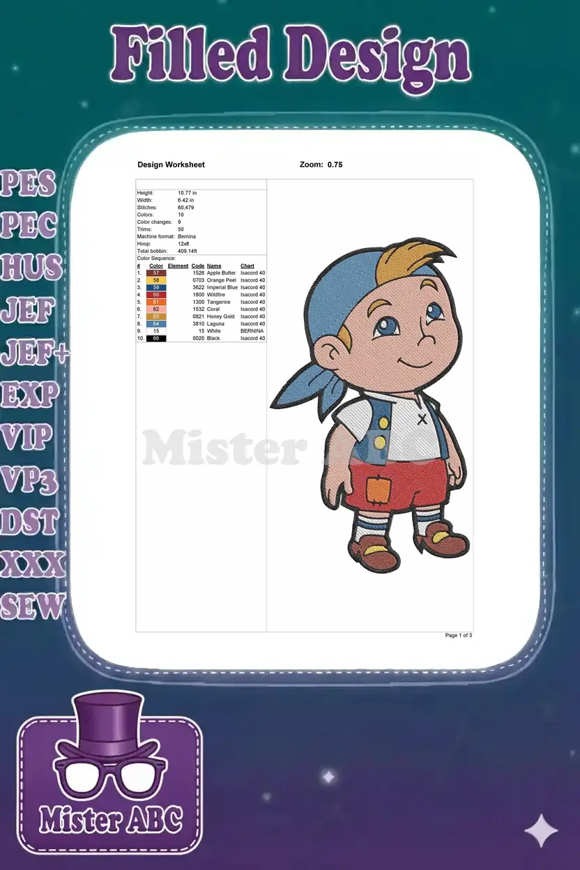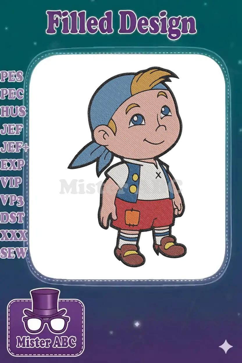 Smiling cartoon boy with blue bandana and patched shorts embroidery designs