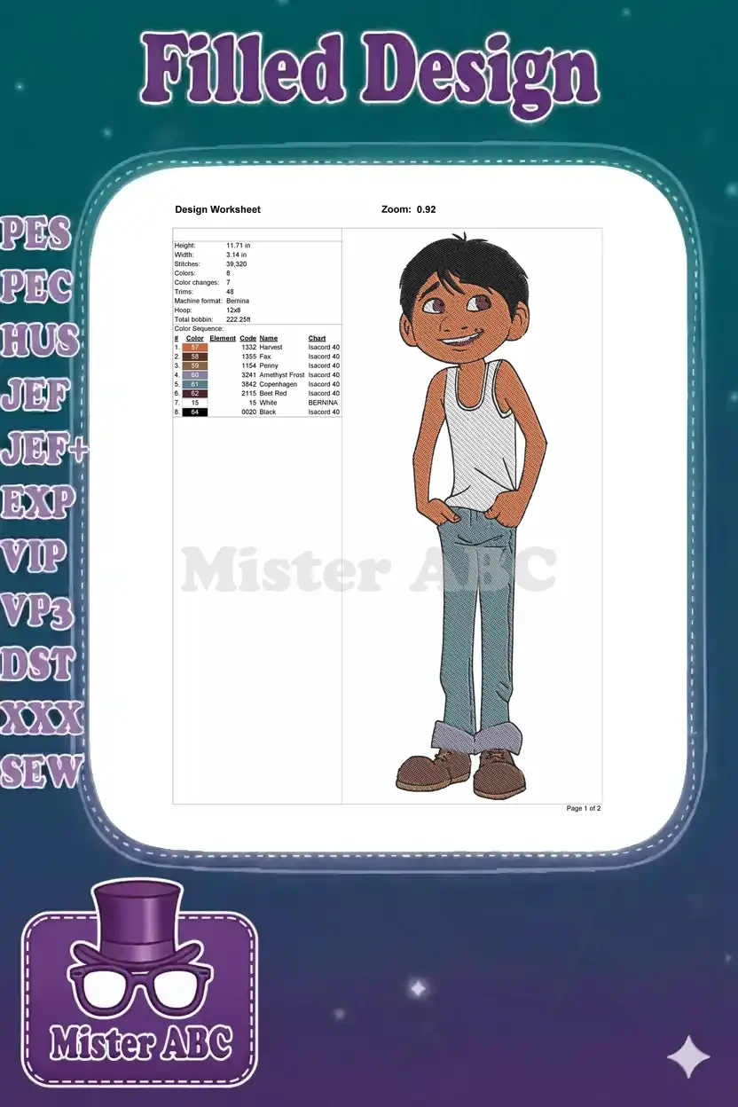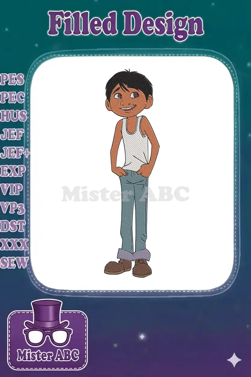 Smiling cartoon boy white tank top blue jeans embroidery designs