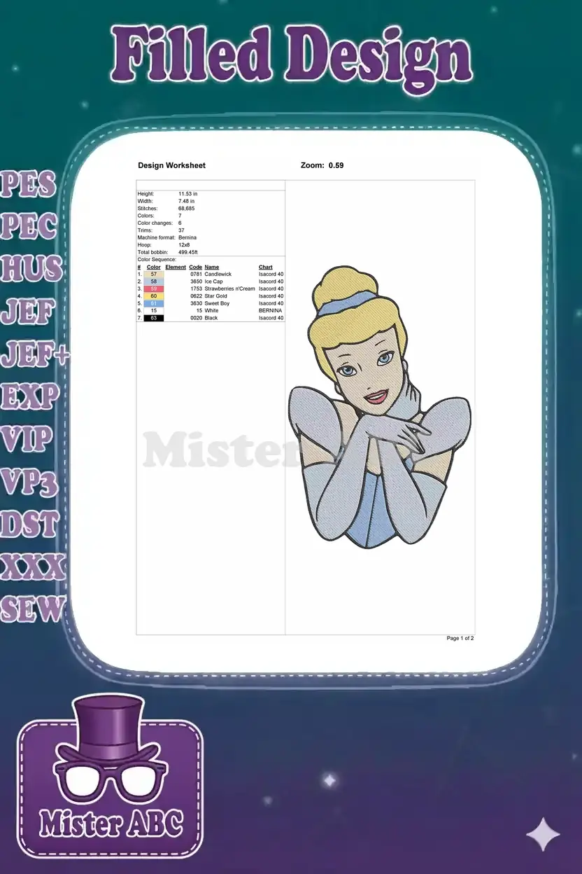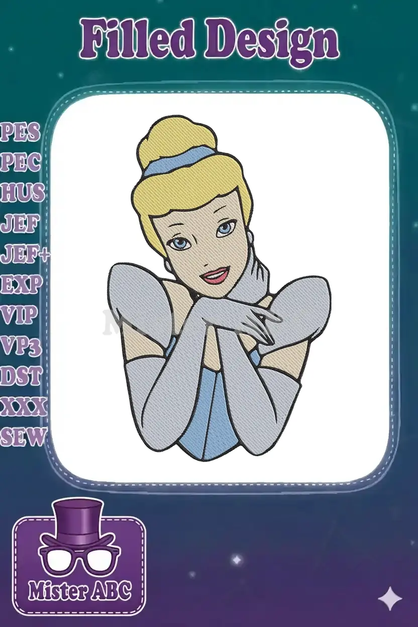 Smiling Cinderella Princess Character Blue Dress Embroidery Designs