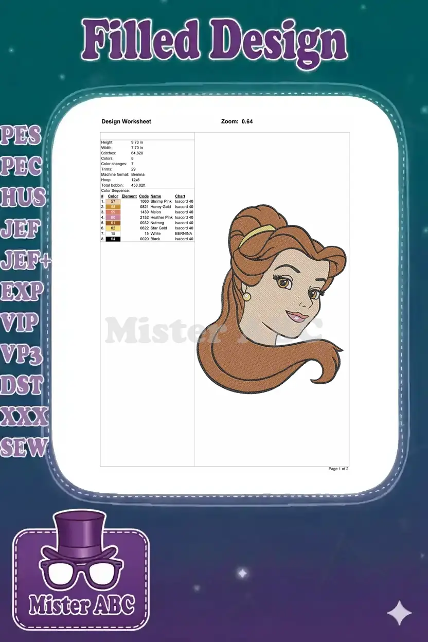 Smiling Disney Princess Belle embroidery designs with elegant brown hair