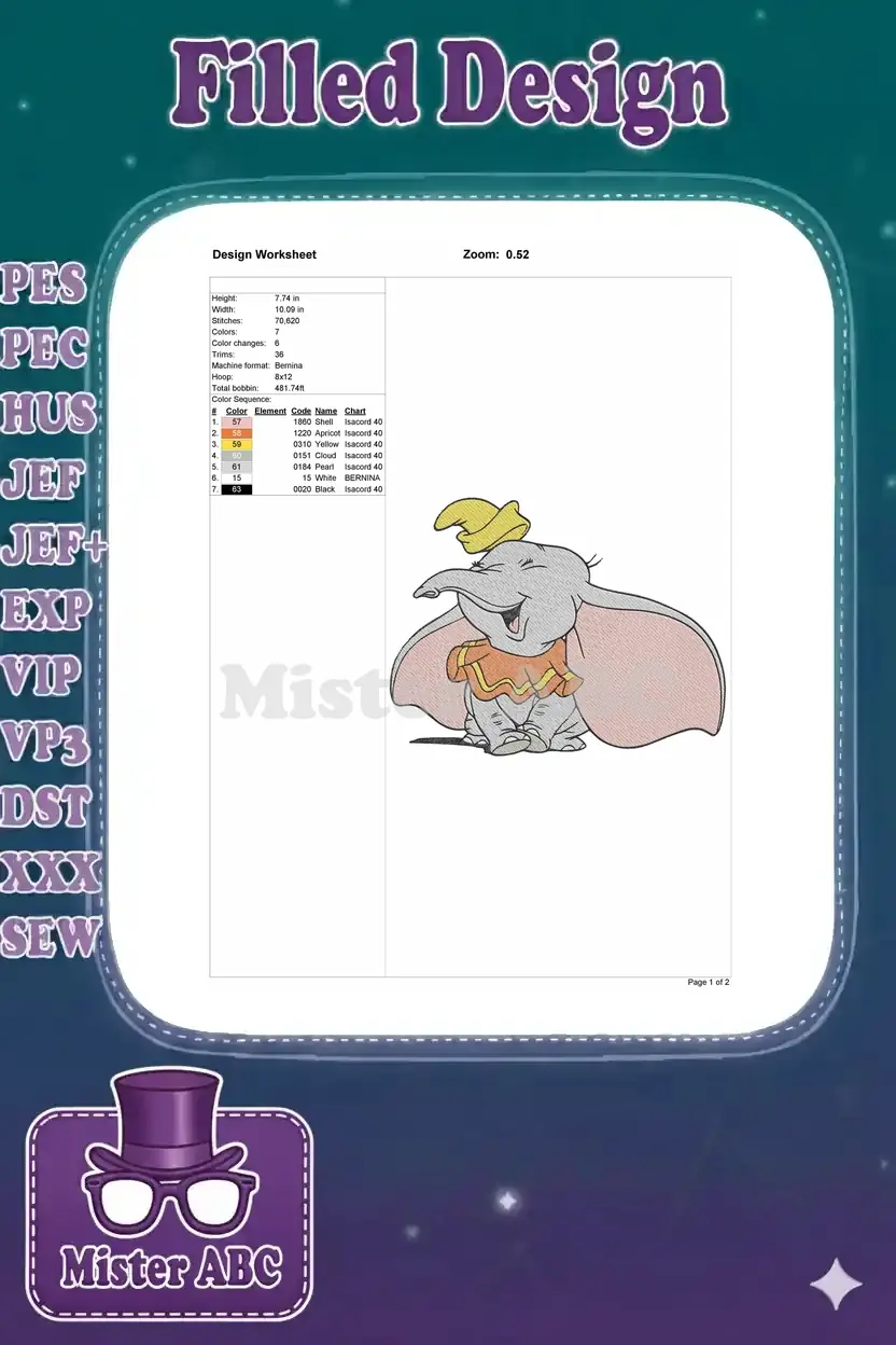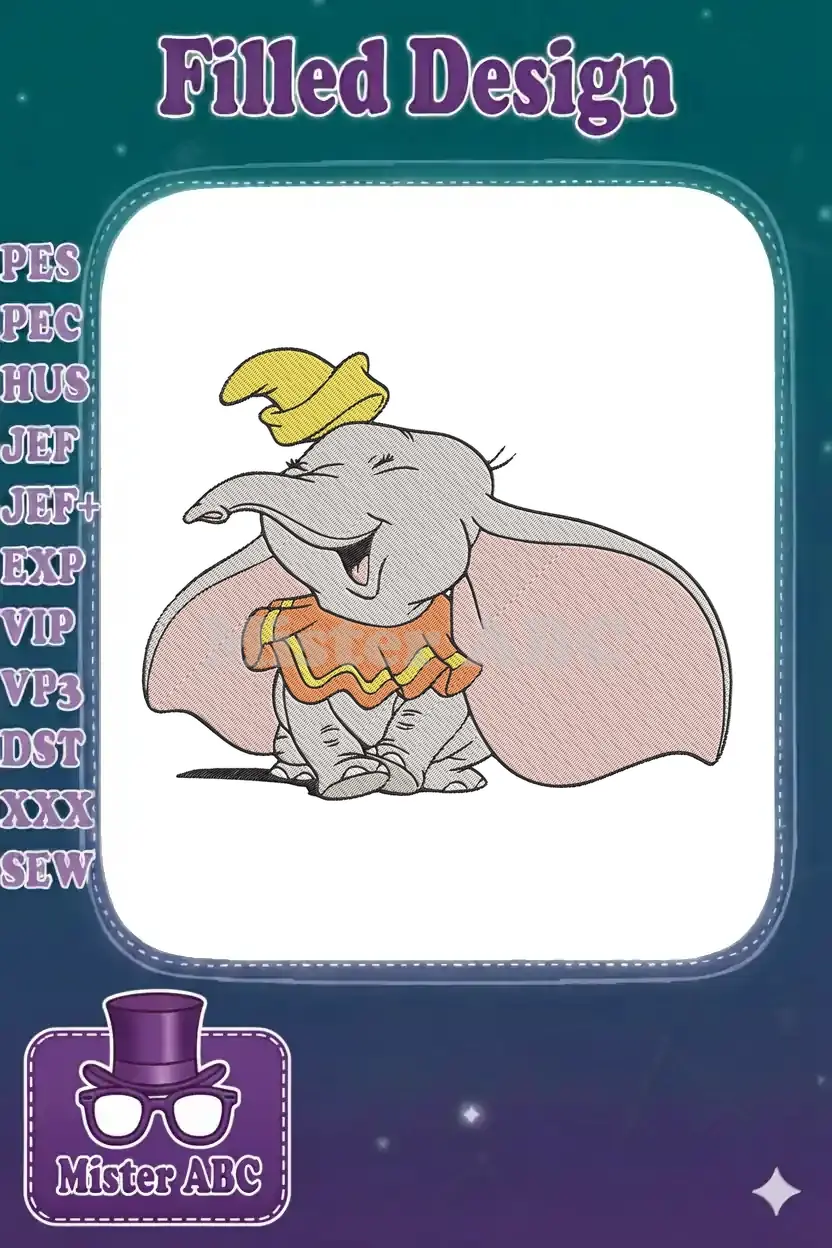 Smiling Dumbo baby elephant with yellow hat embroidery designs