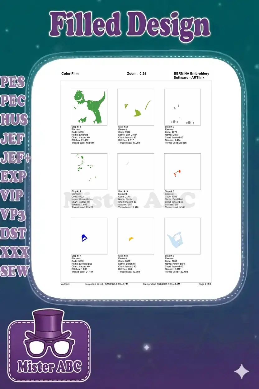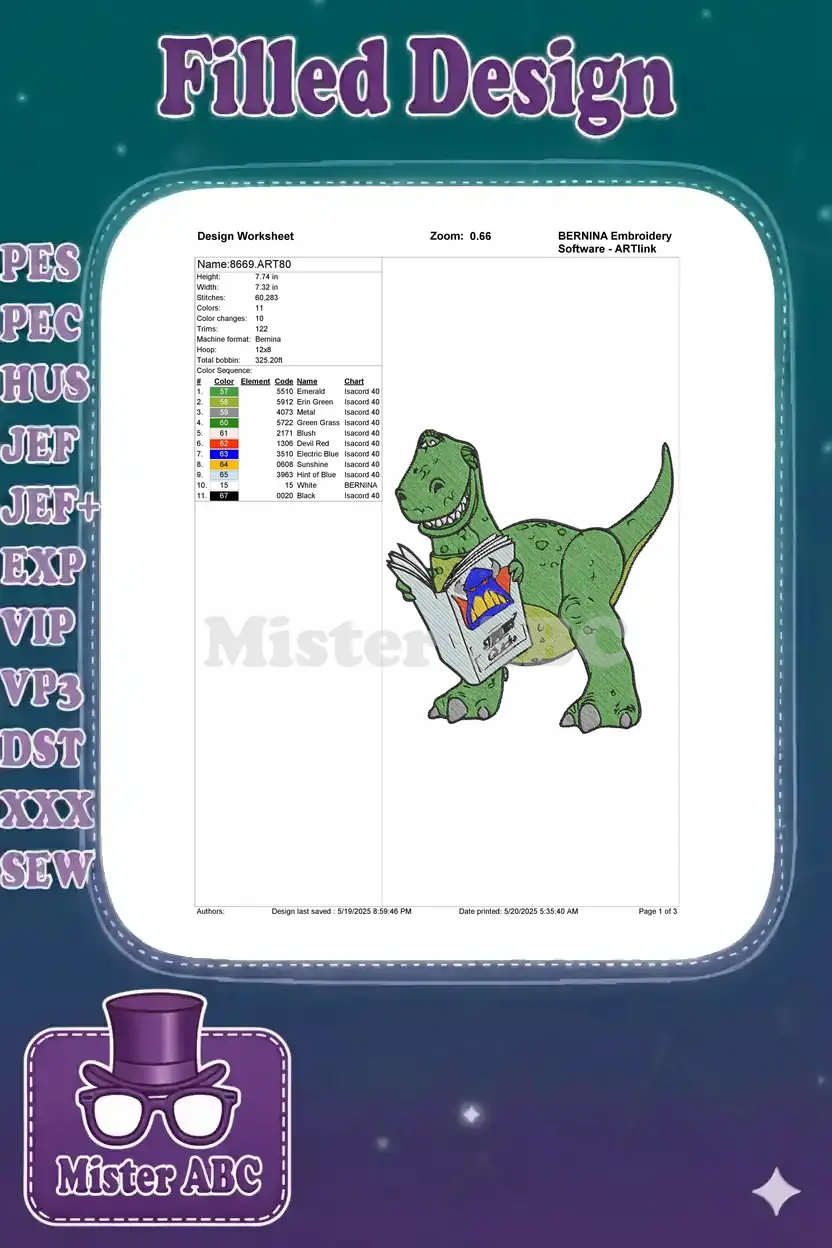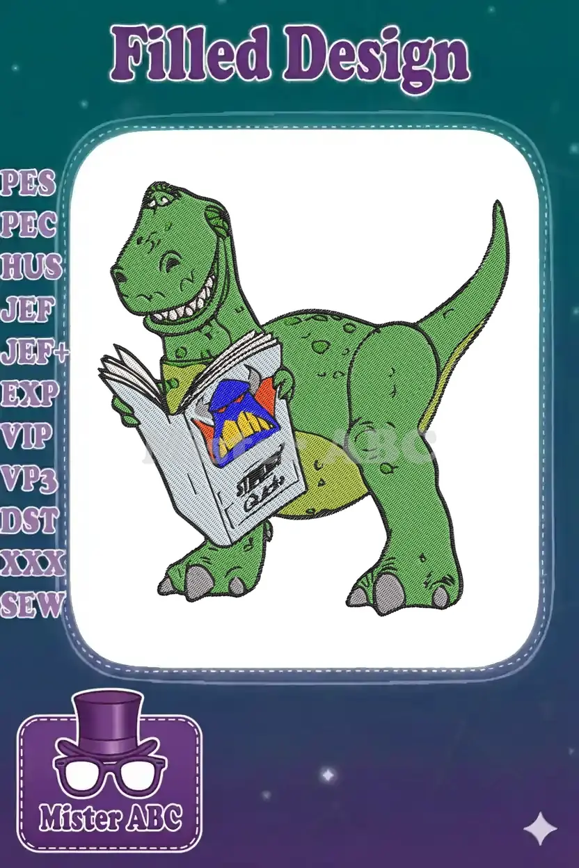 Delightful embroidery of Rex from Toy Story, happily engrossed in a book featuring Buzz Lightyear. Perfect for fans!