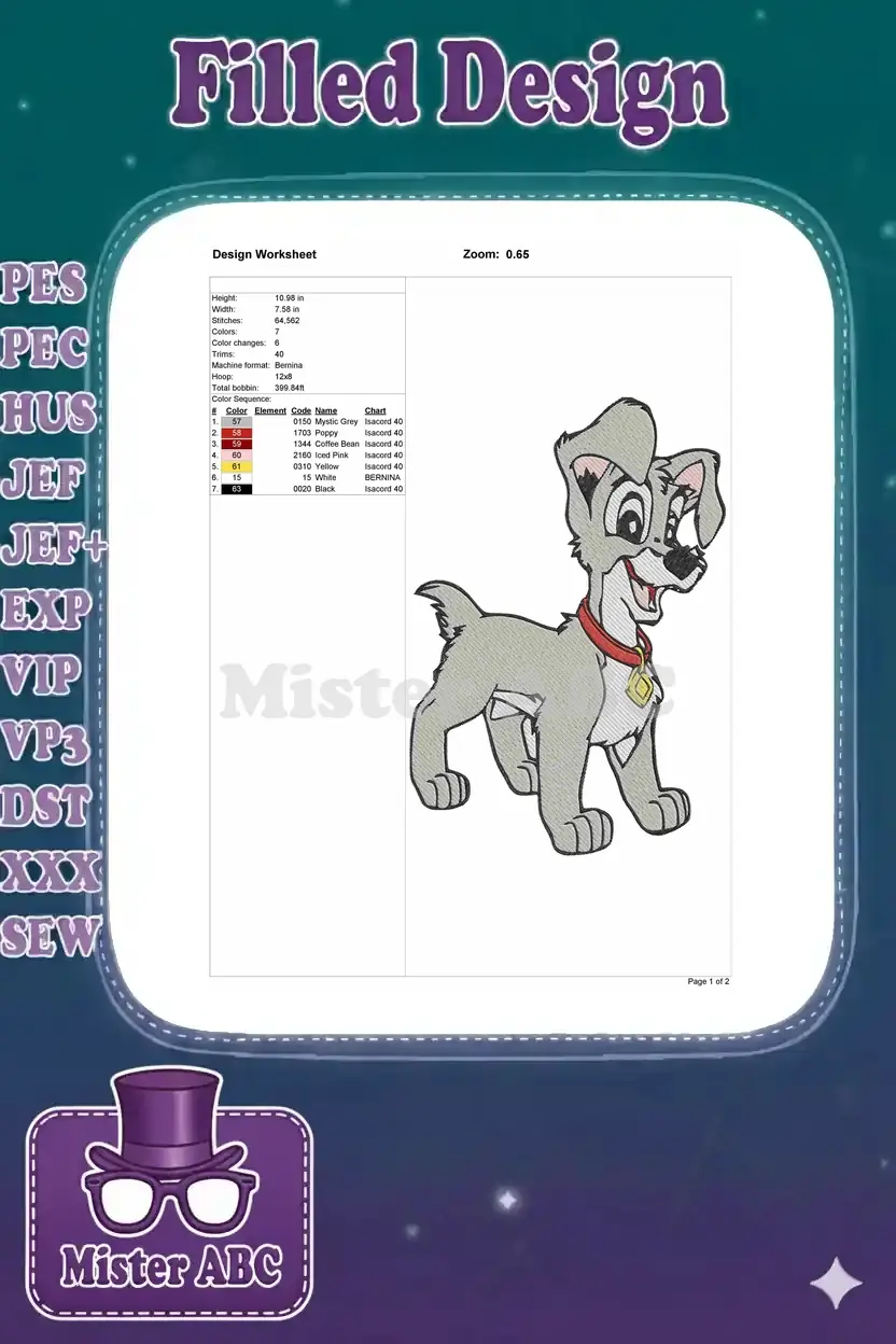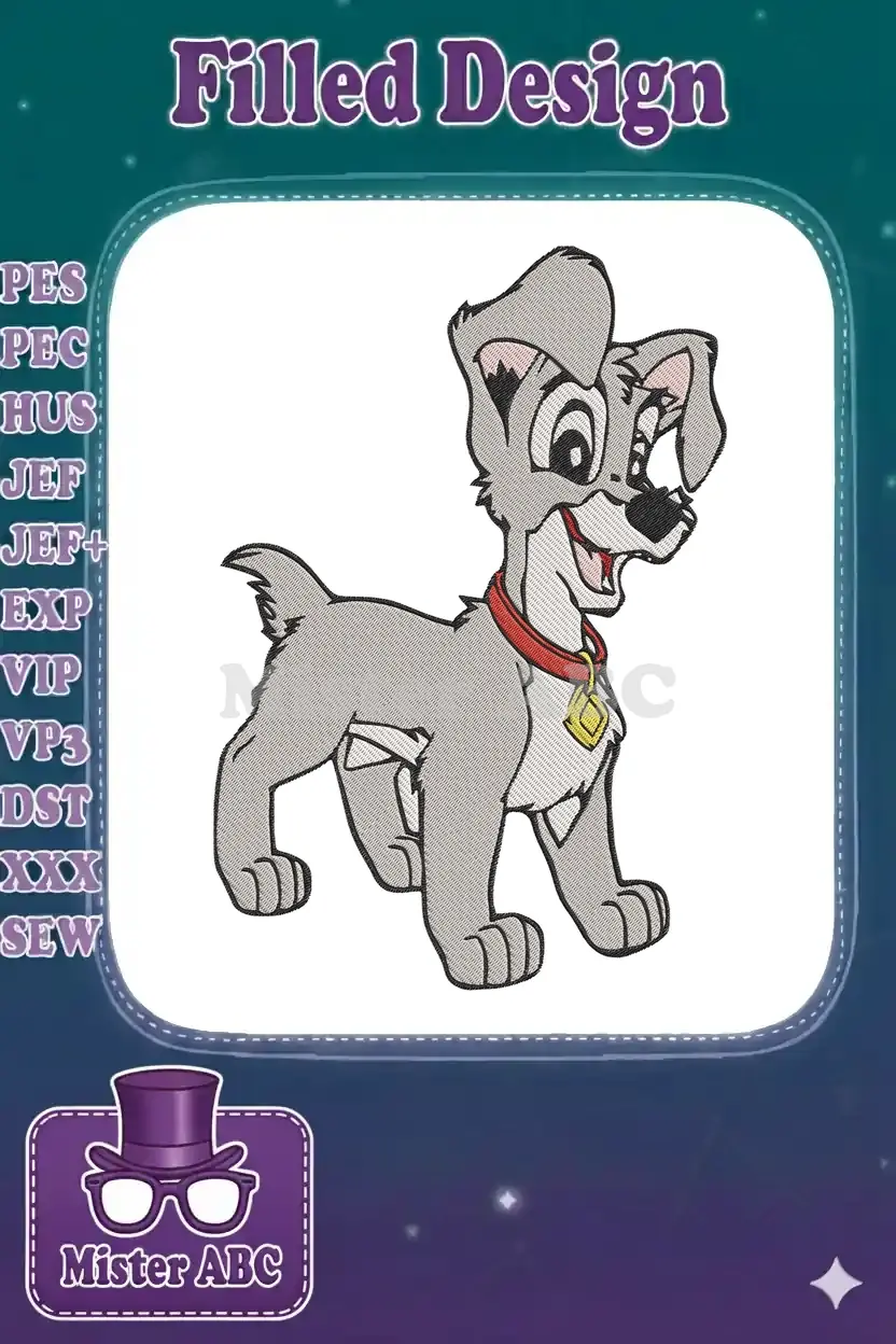 Bring Disney magic to life with this adorable Scamp embroidery design, perfect for fans of Lady and the Tramp! A delightful stitch.