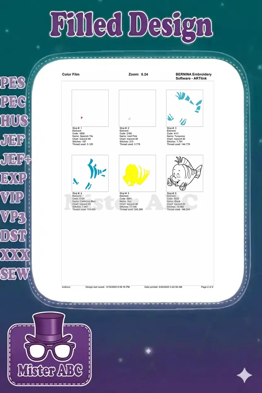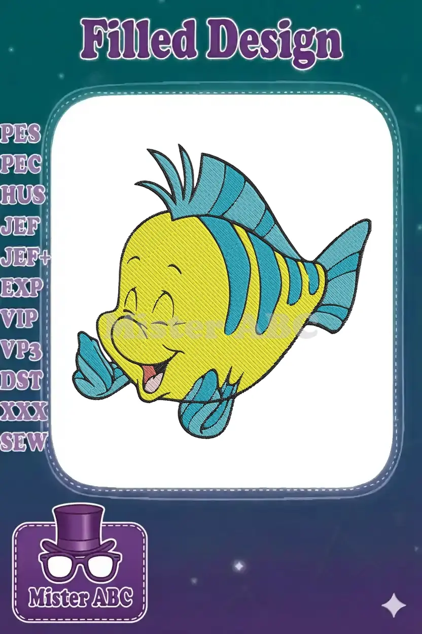 Smiling happy Flounder yellow blue fish character embroidery designs