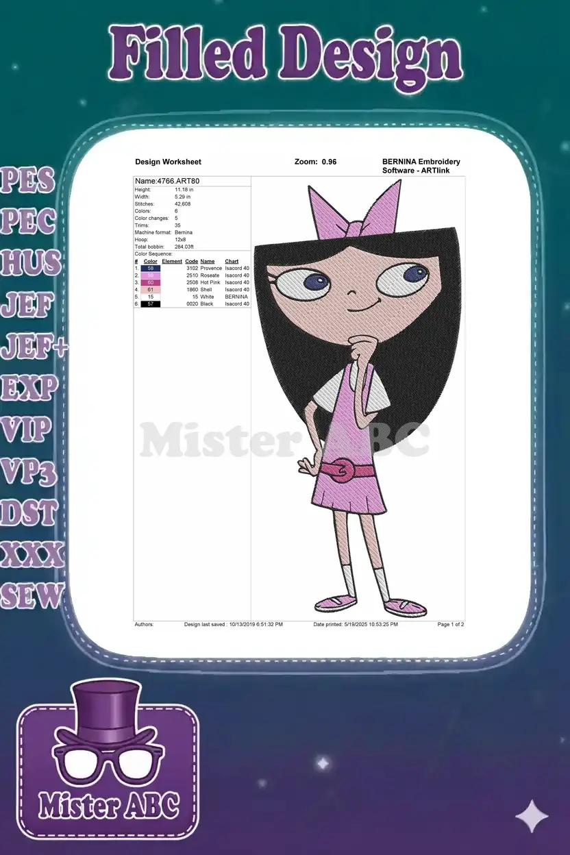 Smiling Isabella Phineas Ferb pink dress bow black hair embroidery designs