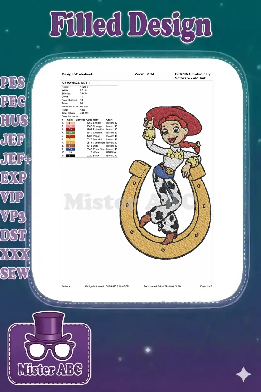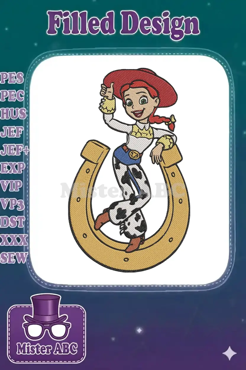 Smiling Jessie Cowgirl from Toy Story Leaning on Horseshoe Embroidery Designs