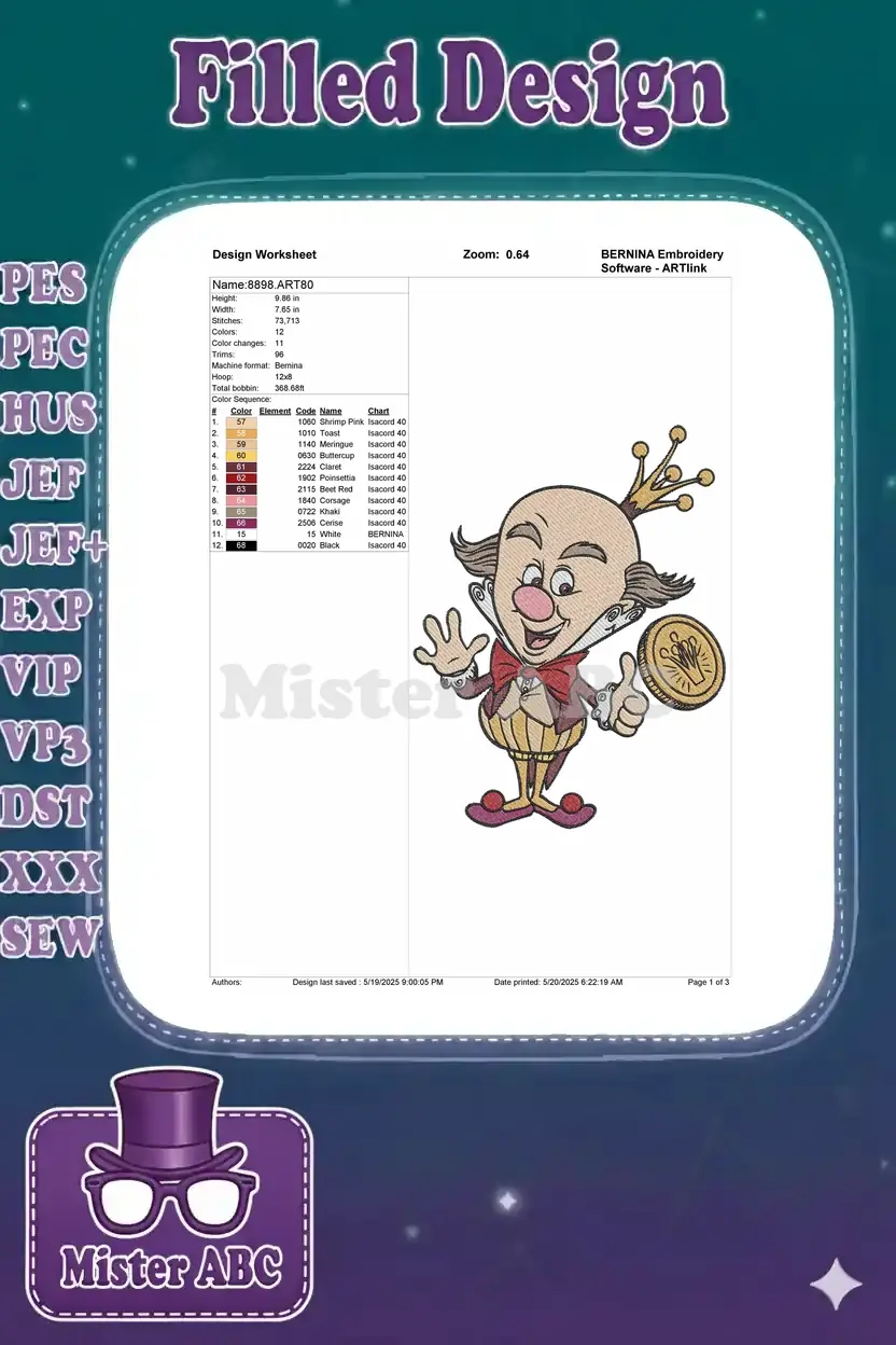 A delightful embroidery design featuring the whimsical King Candy, perfect for adding a playful touch to any project.