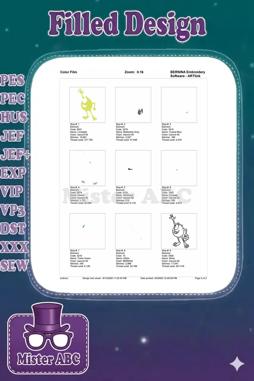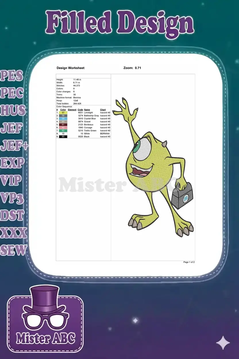 Smiling Mike Wazowski cartoon monster with briefcase embroidery designs